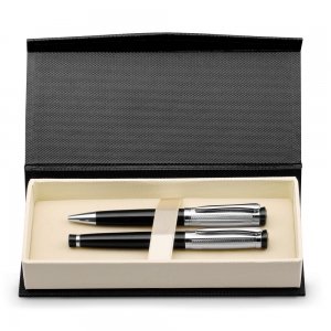 Artikel-Nr: PST81193-107Set bestehend aus Kugelschreiber und Rollerball aus Metall mit Clip. Blauschreibende Mine. Geliefert in einem gepolsterten Geschenketui mit Magnetverschluss. Kugelschreiber Kugelschreiber: ø13 x 136 mm | Roller: ø13 x 135 mm | Etui: 192 x 34 x 85 mm