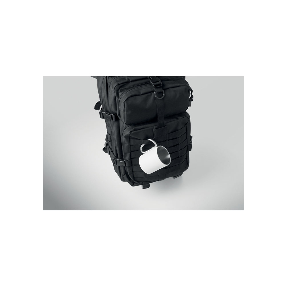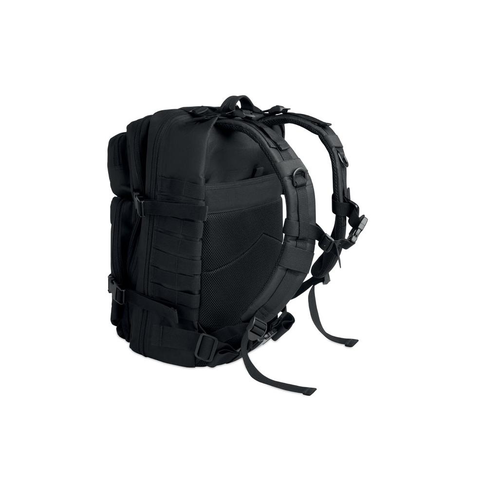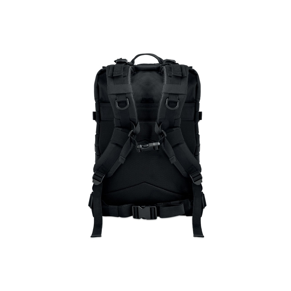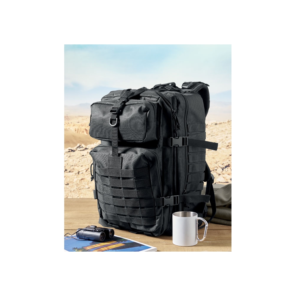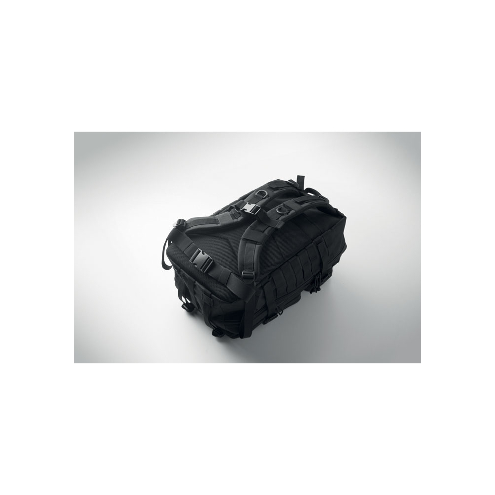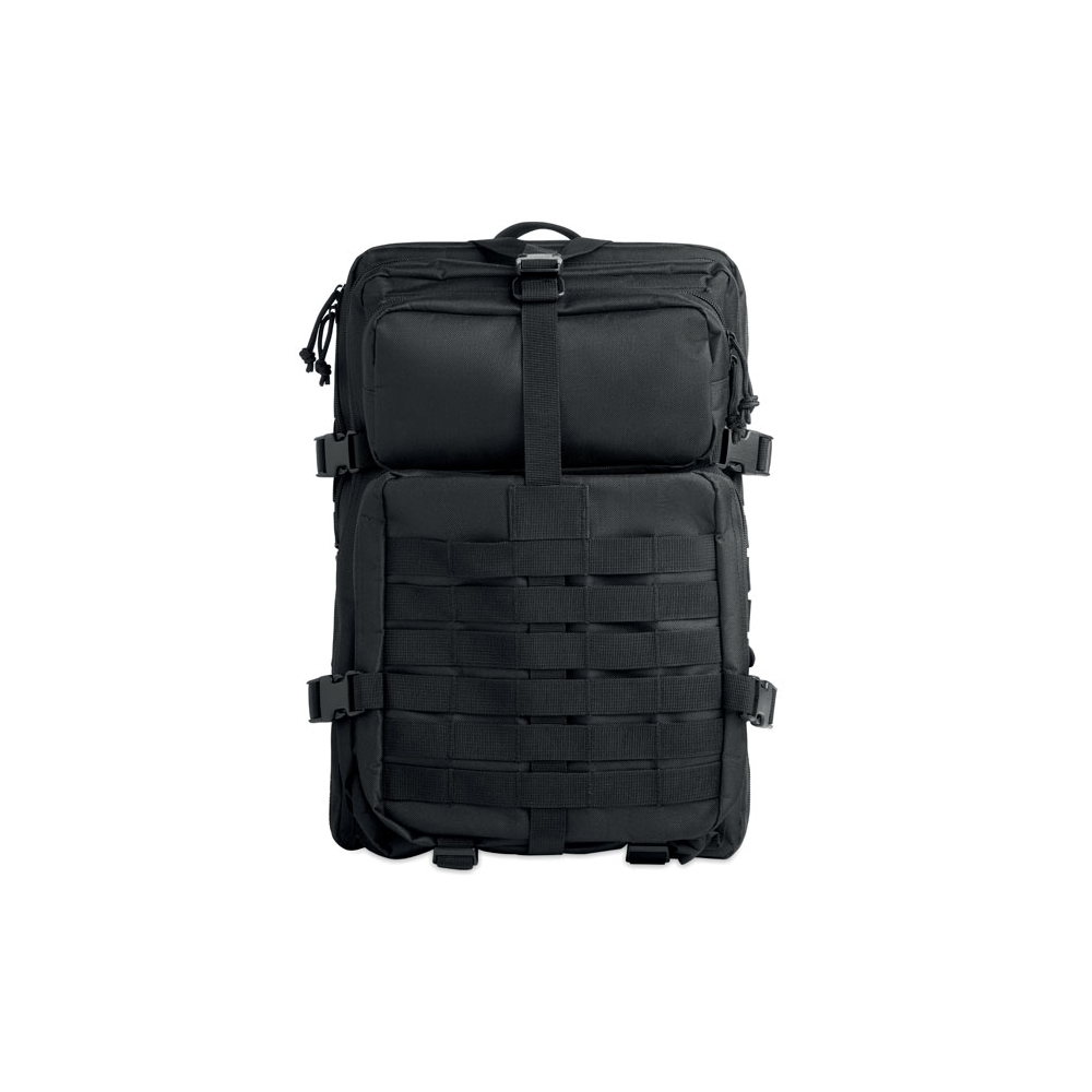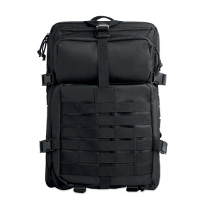 Artikel-Nr: OCBMO2970-03Outdoor-Rucksack aus 600D RPET. Gepolstertes Laptopfach, Innenfächer, Front-Reißverschlusstaschen, gepolsterte Mesh-Schultergurte und Rückenpartie, Hüftgurt und elastische Halterungen. Volumen: 50L.