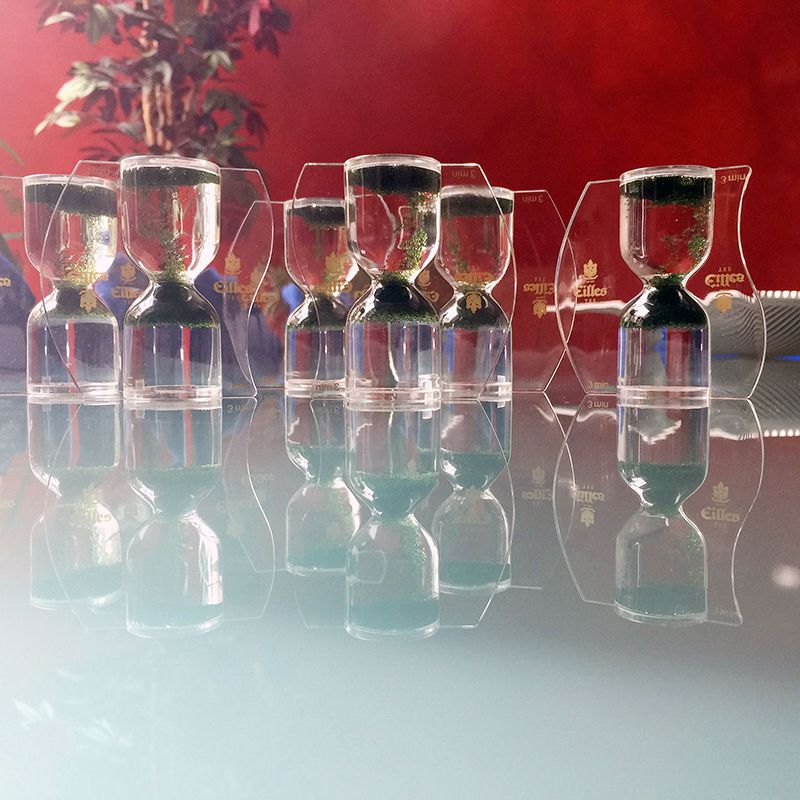 Artikel-Nr: P978Komplett in Sandfarbe und Form individuell gestaltete Sanduhr. Der Sand fließt von unten nach oben. Die Sanduhr hat in diesem Fall eine Laufzeit von ca. 3 Minuten und wird als Teatimer eingesetzt.
