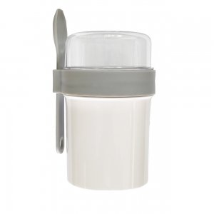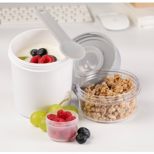Artikel-Nr: NMT655Müsli to go - dein perfekter Begleiter für einen energiegeladenen Start! Mit Löffel und Zusatzbehälter im Inneren Material: PP, PC, Silikon Inhalt: 560 ml (Becher), 230 ml (transparenter Deckel), 35 ml (Zusatzbehälter) Maße: Ø 99 mm x 157 mm Gewicht ohne Verpackung: 144 g Kunststofffreie Einzelverpackung Werbeanbringung: Auf dem Körper, 20 x 40 mm (D2) Dieses Produkt unterstützt aktiv den Ausgleich der entstehendenCO2-Emissionen durch zertifizierte Klimaschutzprojekte