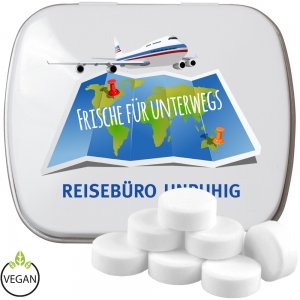 Artikel-Nr: FNM00255Mintdose weiß aus Metall. Werbeanbringung als Direktdruck in 4c individuell bedruckbar. Zutaten Pfefferminz Drops zuckerfrei: Süßungsmittel: Sorbit, Steviolglycoside; Trennmittel: Magnesiumsalze von Speisefettsäuren, Minzöl, Menthol, Siliciumdioxid.