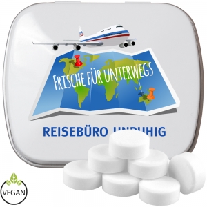 Artikel-Nr: FNM00255Mintdose weiß aus Metall. Werbeanbringung als Direktdruck in 4c individuell bedruckbar. Zutaten Pfefferminz Drops zuckerfrei: Süßungsmittel: Sorbit, Steviolglycoside; Trennmittel: Magnesiumsalze von Speisefettsäuren, Minzöl, Menthol, Siliciumdioxid.