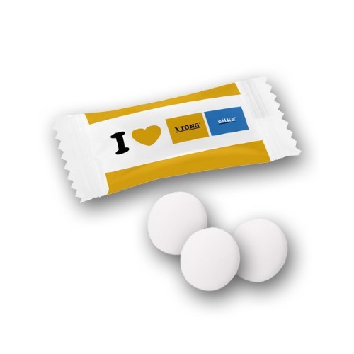 Artikel-Nr: W965S0066Leckere Minze - einzeln verpackt. Eine begehrte kleine Süßigkeit auf Messen und Events, aber auch auf dem Verkaufstresen und an der Kasse. Die optimale Logogröße für diesen Artikel ist 30 x 20 mm.