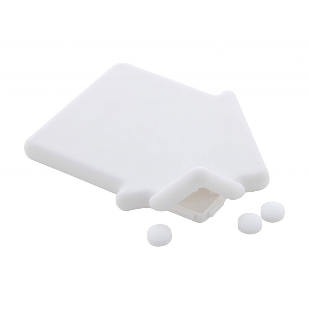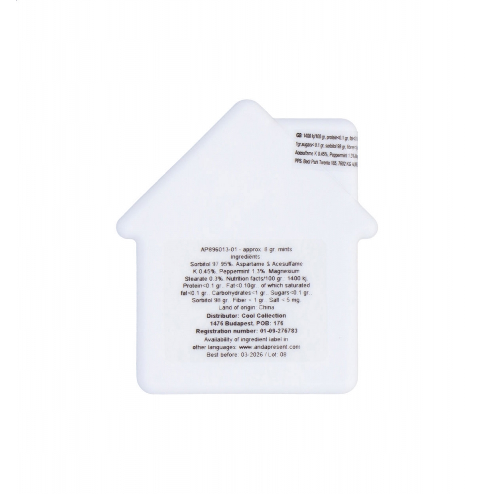 Artikel-Nr: AND896013-01Hausförmiger Mintspender aus Kunststoff mit ca. 8 Gramm zuckerfreien Mentholbonbons.