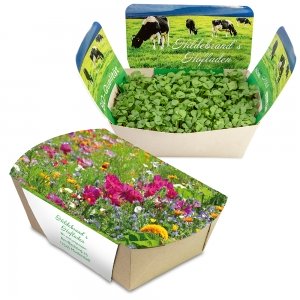Artikel-Nr: HOP12.30028.00-somEventcharakter in Miniaturformat bietet das Pflanzodrom. Mit dem Wortteil "drom" verbindet man große Stadien, Hallen, Gebäude und Veranstaltungen. Und genau dafür ist das Mini-Gärtchen gemacht: Mit aufgesteckten, thematisch passenden Seitenteilen entsteht beispielsweise ein Fußball- oder Sportstadion, ein Bauernhof, ein Osternest, ein Ausmalbild für Kinder oder viele weitere Gebäude und Behältnisse, die passend zur Marke, einer Veranstaltung oder einem saisonalen Thema gestaltet werden können. Außerdem wird ein weiterer Trend fokussiert: Gesunde Lebensmittel stehen im Blickpunkt der Kunden. In der Schale aus Bambuspapier können Kresse, Basilikum, Kräutermischung oder Gewürzpaprika angebaut werden. Aber ebenso Gras, Sonnenblumen und weitere Samen nach Wahl. Geliefert wird das Pflanzodrom mit einer Substrattablette als Erde und einer Samentüte. Unter der rundum individuell bedruckten Banderole liegen die individuell gestaltbaren Steckteile parat und transportieren perfekt die grüne Werbebotschaft.