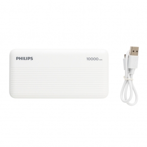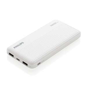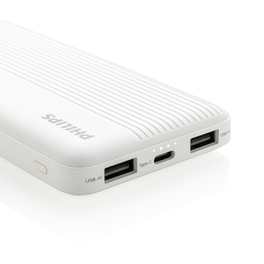 Artikel-Nr: XND322303Philips Powerbank mit 10.000 mAh und dualem USB-A-Output. Fortschrittlicher Sicherheitsschutz und Ladestandssanzeigen. Langlebiger Li-Polymer-Akku. Eingang Micro-USB: 5V/2A; Type-C-Input: 5V/2A; USB-A Output 1: 5V/1A; USB-A Output 2: 5V/2.1A. Verpackt in Philips Geschenkbox