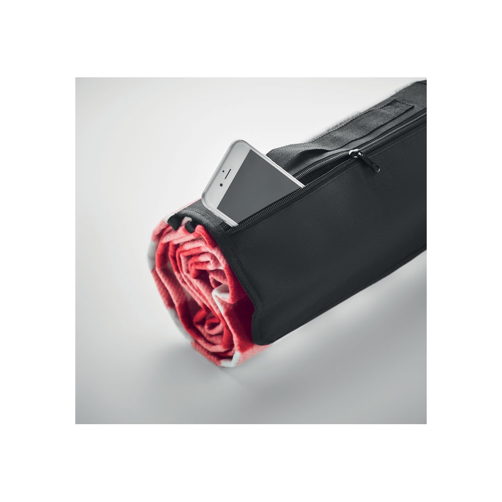 Artikel-Nr: OCBMO6891-05Faltbare Picknickdecke aus RPET Polar-Fleece 150 g / m² mit wasserabweisend beschichteter PEVA-Rückseite. Reißverschlusstasche auf der Vorderseite und kurzer Tragegriff .