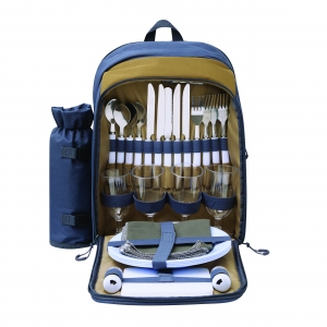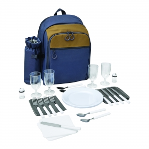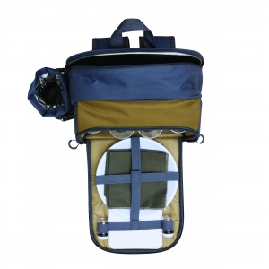 Artikel-Nr: INP56-0604086Picknick-Rucksack SMART TRIP für 4 Personen: isoliertes Reißverschluss-Kühlfach, Reißverschluss-Mittelfach inkl. Edelstahl-Besteck mit Kunststoffgriffen, Kunststoff-Weingläsern und -Tellern, Stoffservietten, Salz- und Pfefferstreuer, Reißverschluss-Vorfach, Trageschlaufe, gepolsterte Schultergurte, 1 abnehmbare isolierte Flaschenhalterung an der Seite