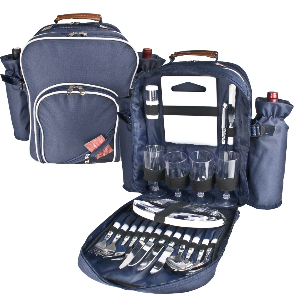 Artikel-Nr: EAG660704Picknickrucksack (vier Personen) + drei Kühleinheiten. Teller, Gläser, Besteck, Brettchen, Kellnermesser, Brotmesser sowie Salz- und Pfefferstreuer. Ihre Werbung drucken wir auf das Vorderfach.
