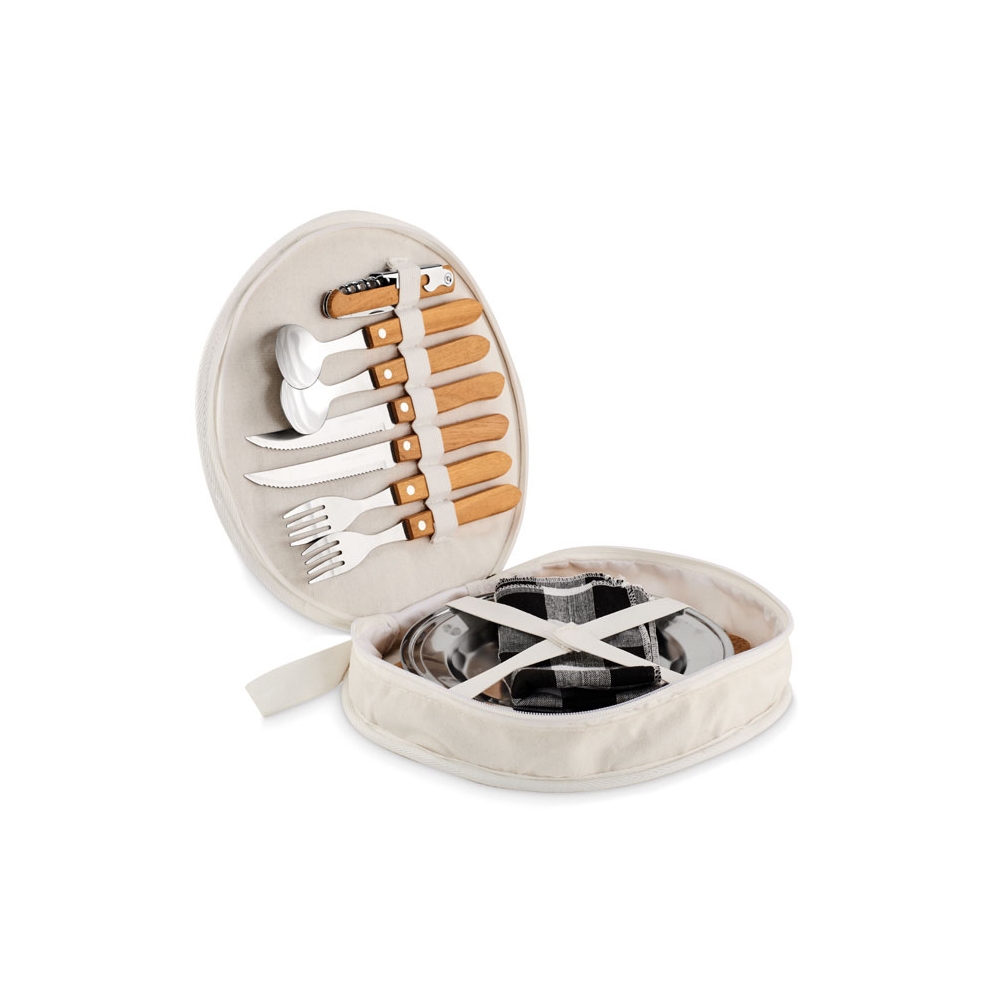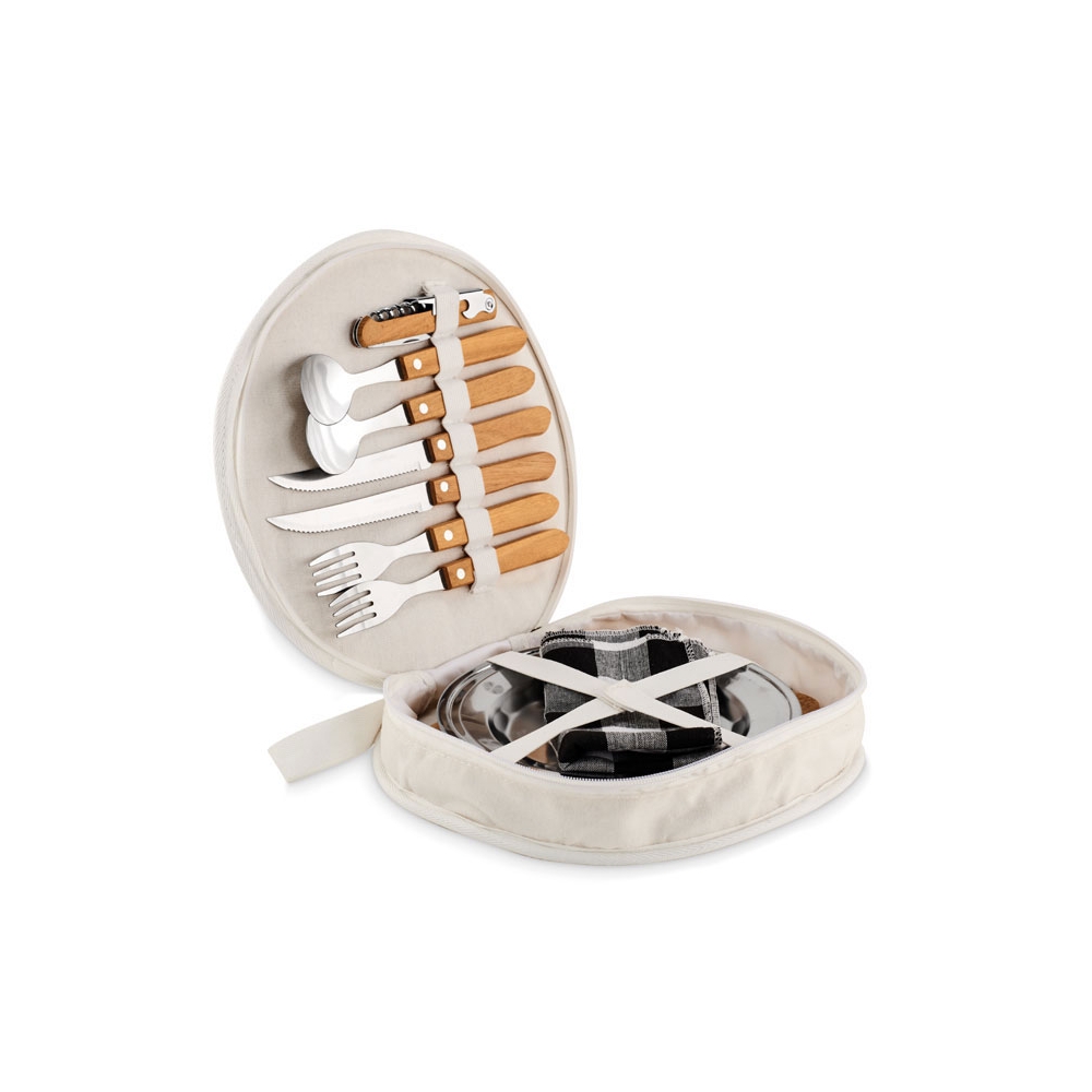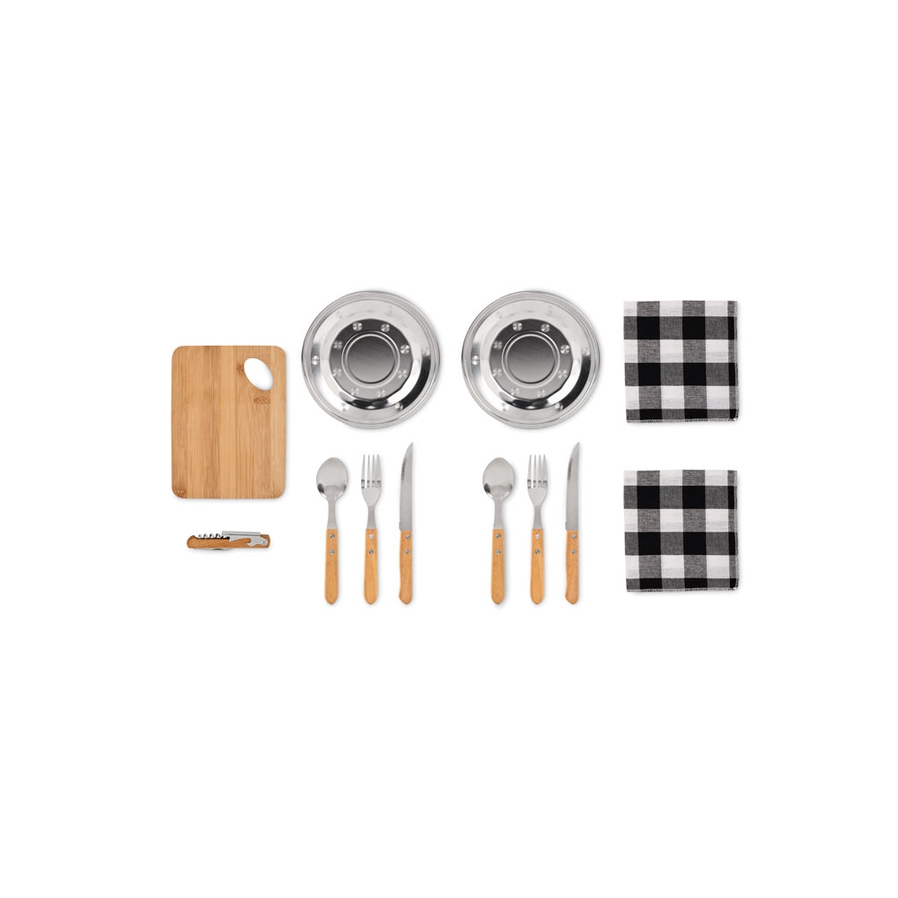 Artikel-Nr: OCBMO6893-13Picknick-Set für 2 Personen mit Tellern, Besteck und Kellnermesser aus Edelstahl. Schneidebrett. Lieferung in einer Tasche aus Baumwolle. Bambus ist ein natürliches Produkt, es kann daher zu leichten Abweichungen in Farbe, Dekor und Maßen kommen.