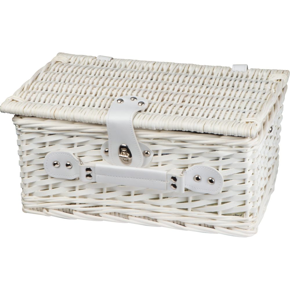 Artikel-Nr: EAG144606Mini-Picknickkorb aus Weidengeflecht für zwei Personen mit Keramiktellern und -tassen, Edelstahlbesteck und Salz- und Pfefferstreuer. Ihre Werbung lasern wir auf ein Metallemblem, dass dann am Korb befestigt wird.