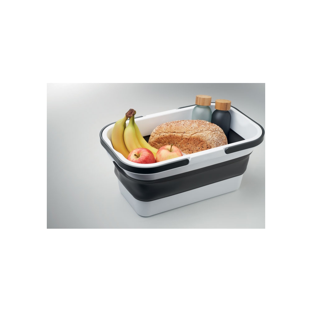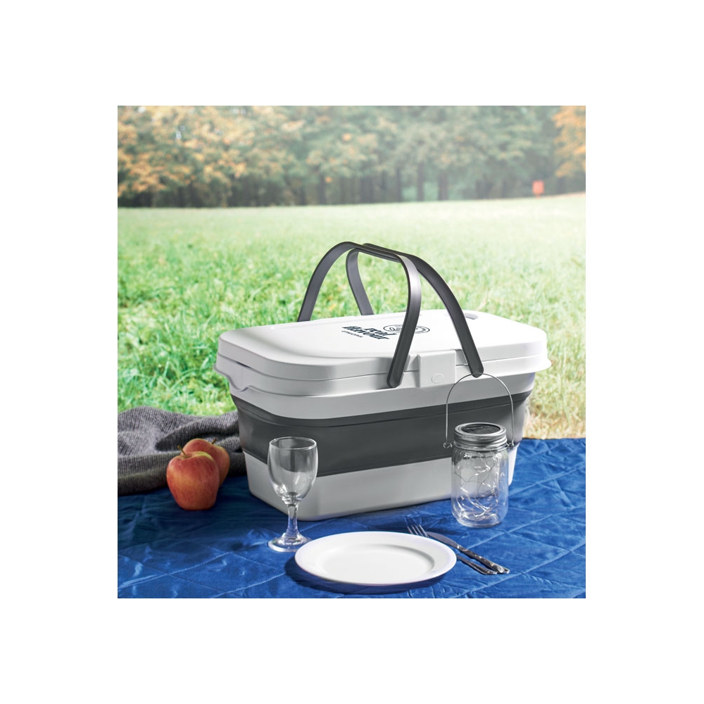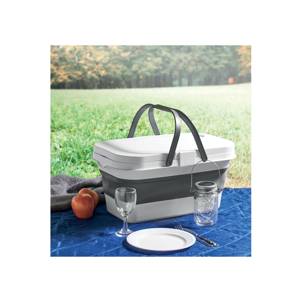 Artikel-Nr: OCBMO2227-06Faltbarer Picknickkorb aus Silikon mit Deckel aus PP. Der Deckel dient als Ablagefläche. Ohne Zubehör. Füllmenge: 16 l.