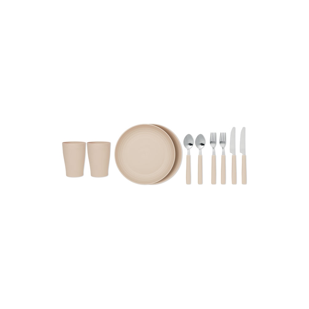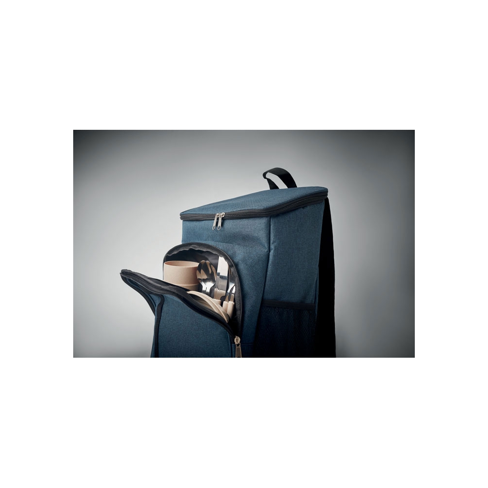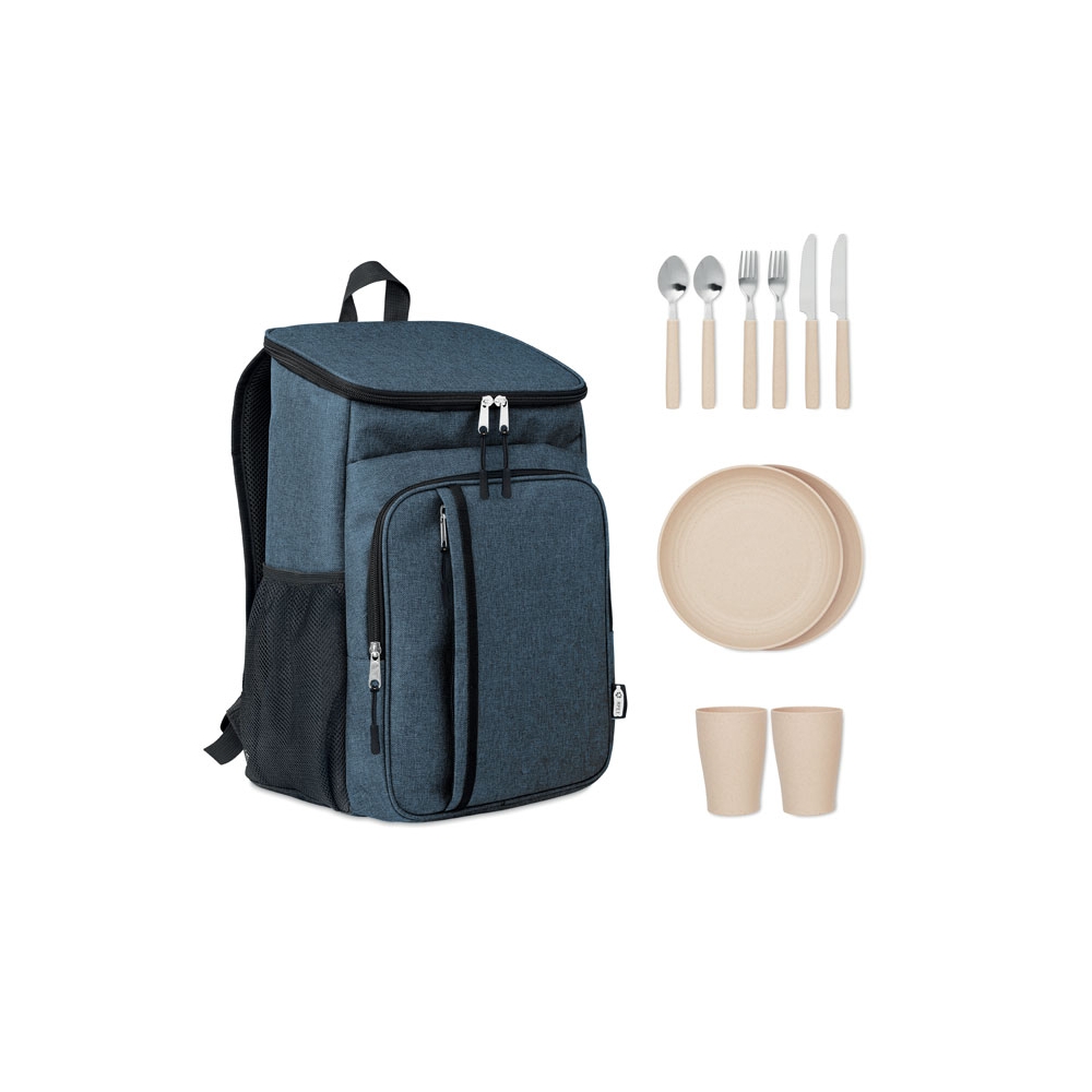 Artikel-Nr: OCBMO6167-04Picknickrucksack mit Kühlfach in 2 tone 600D RPET mit Zubehör für 2 Personen: Teller und Becher aus PP, Besteck aus Edelstahl mit Griffteil im gleichen Materialmix.