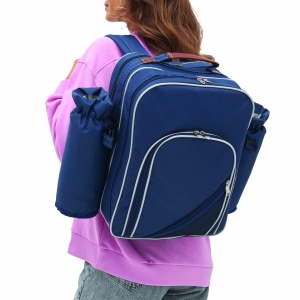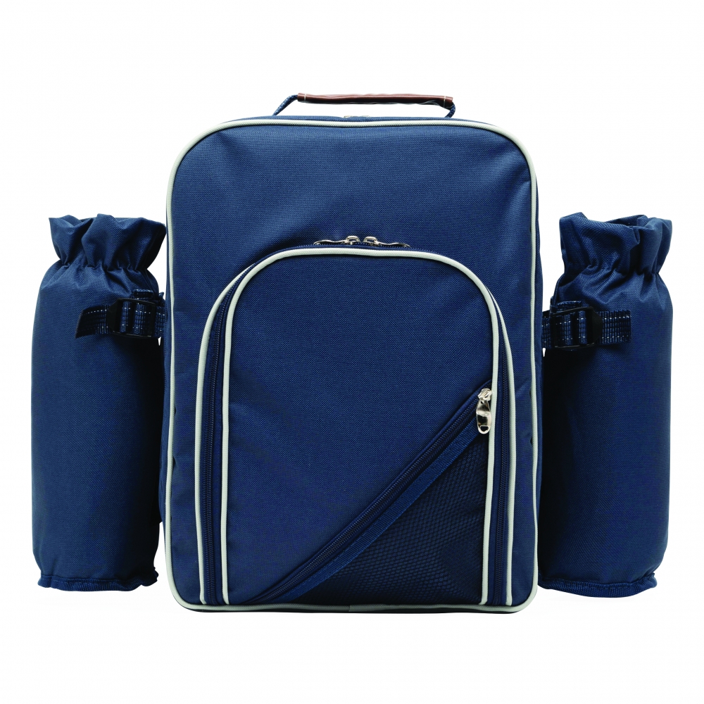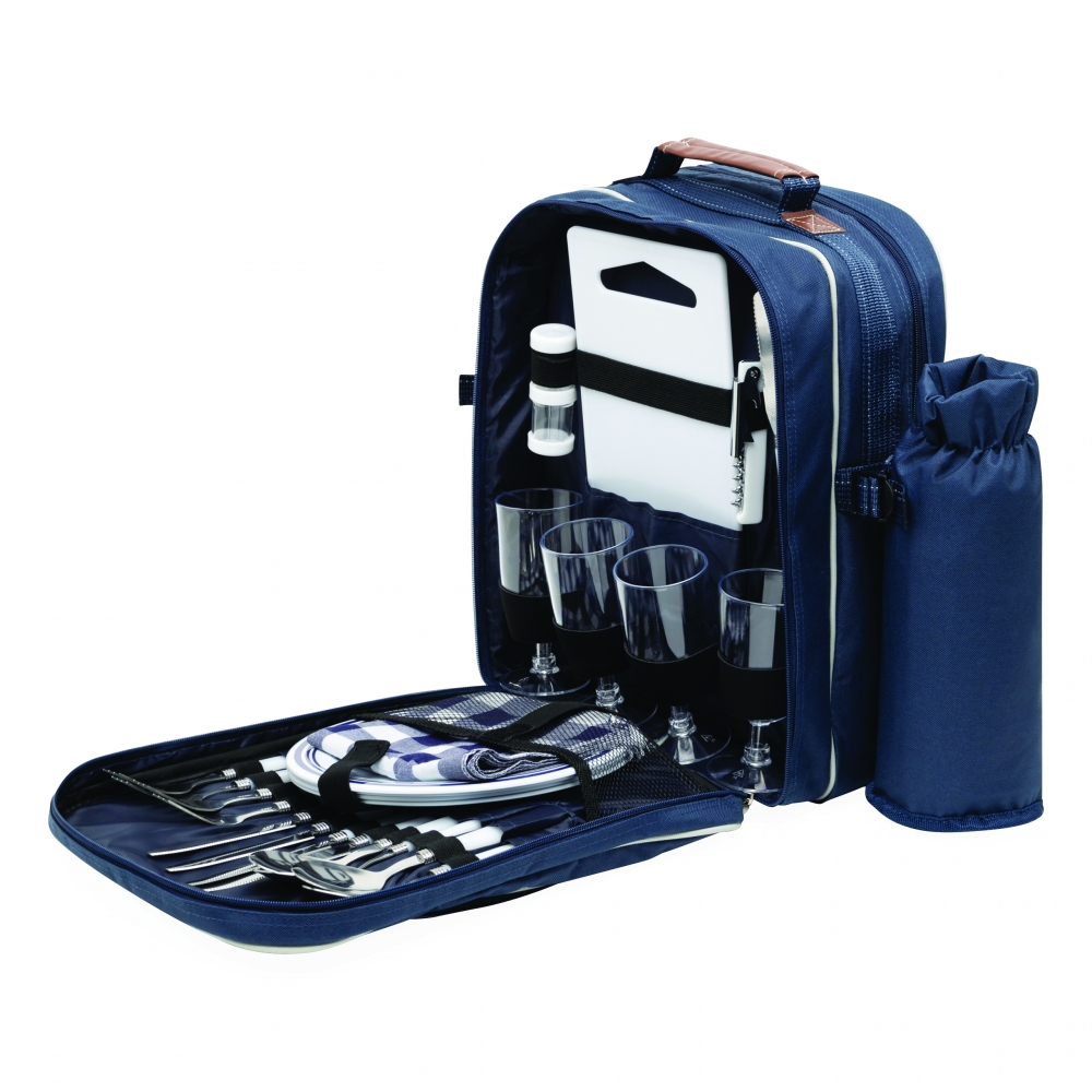 Artikel-Nr: INP56-0604020Picknick-Rucksack HYDE PARK für 4 Personen mit isoliertem Reißverschluss-Kühlfach: inkl. Besteck mit Kunststoffgriffen, Kunststoff-Weingläser und -Teller, Käsemesser, Kellnermesser, Stoffservietten, Salz- und Pfefferstreuer sowie Schneidebrett, 2 abnehmbare isolierte Flaschenhalterungen an den Seiten