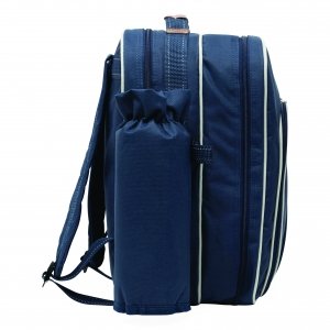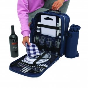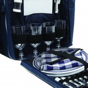 Artikel-Nr: INP56-0604020Picknick-Rucksack HYDE PARK für 4 Personen mit isoliertem Reißverschluss-Kühlfach: inkl. Besteck mit Kunststoffgriffen, Kunststoff-Weingläser und -Teller, Käsemesser, Kellnermesser, Stoffservietten, Salz- und Pfefferstreuer sowie Schneidebrett, 2 abnehmbare isolierte Flaschenhalterungen an den Seiten