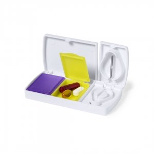 Artikel-Nr: KTO18781000000Pillendose aus glattem, robustem Material in Weiß. Mit 2 Innenfächern, Sicherheitsverschluss und Klinge zum Teilen der Pillen.