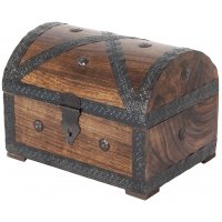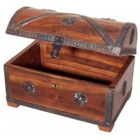 Rustikale Massivholz-Truhe mit nostalgischen Metallbeschlägen. Darin kann man z. B. den Schmuck vom letzten Beutezug oder seine Dukaten verwahren.