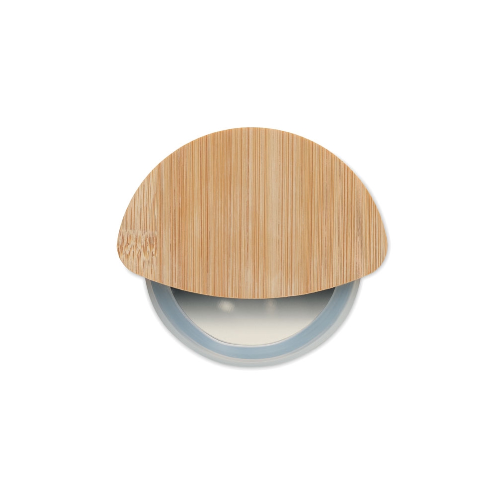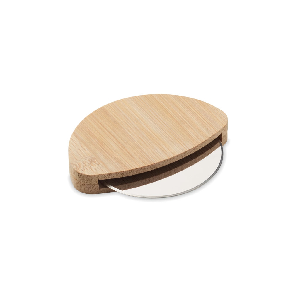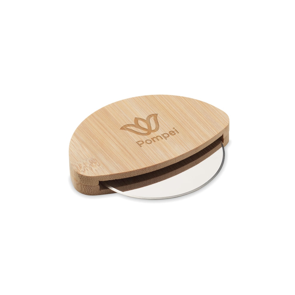 Artikel-Nr: OCBMO2913-40Runder Pizzaschneider. Klinge aus Edelstahl und Griffteil aus Bambus. Mit transparentem, weißem Schutz aus Silikon.