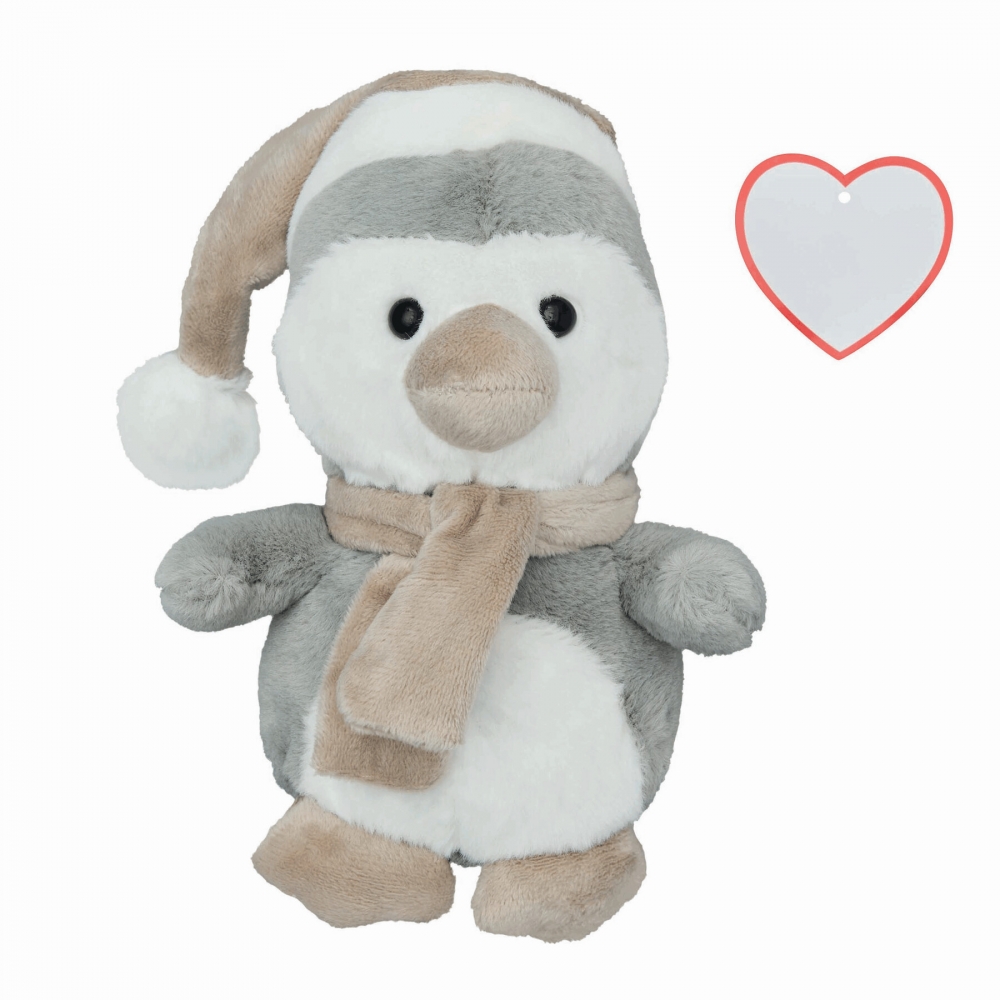 Artikel-Nr: INP56-0502068Plüsch-Pinguin PIPITO: besonders weiches Fell – Mütze, Nase, Füße und Schal um den Hals aus Stoff, mit Herzanhänger zum Bedrucken