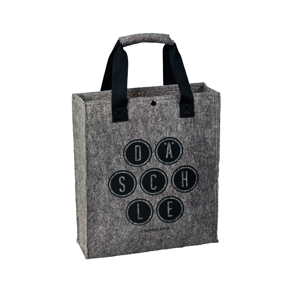 Artikel-Nr: GUT44184Eine Tasche nicht nur für Einkaufstouren - super stabil und edel in grau. Verschließbar mit einem Druckknopf. Die schwarzen Griffe runden die Tasche ab und werden am oberen Teil mit grauem Filz verstärkt – dies sorgt für ein noch besseres Tragegefühl. und Platz, wenn mal ein paar Dinge transportiert werden müssen - diese Tasche bietet aber nicht nur Platz für viele Dinge, sondern natürlich auch für Ihre Werbung!