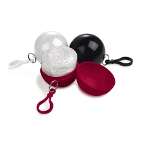 Transparenter “Notfallponcho”, verpackt in einem Kunststoffball mit Karabiner.