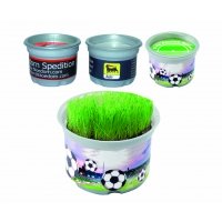 Inhalt: Kunststoffdöschen silberfarben mit Deckel, Wachstumsgranulat, Samen: Fußball-Rasen