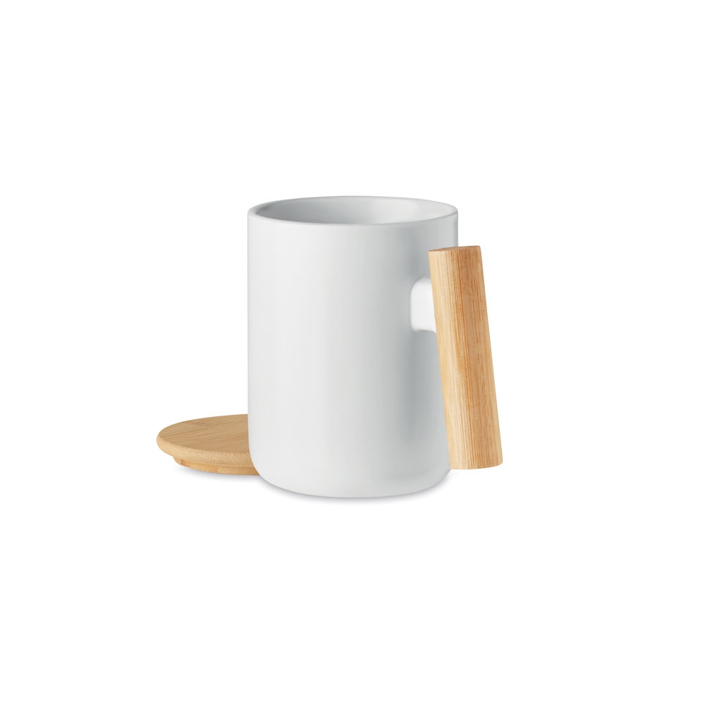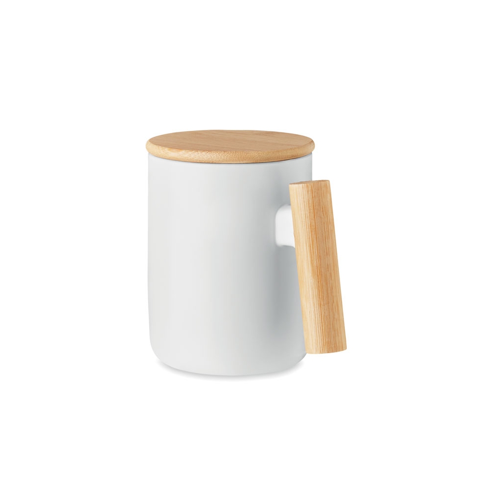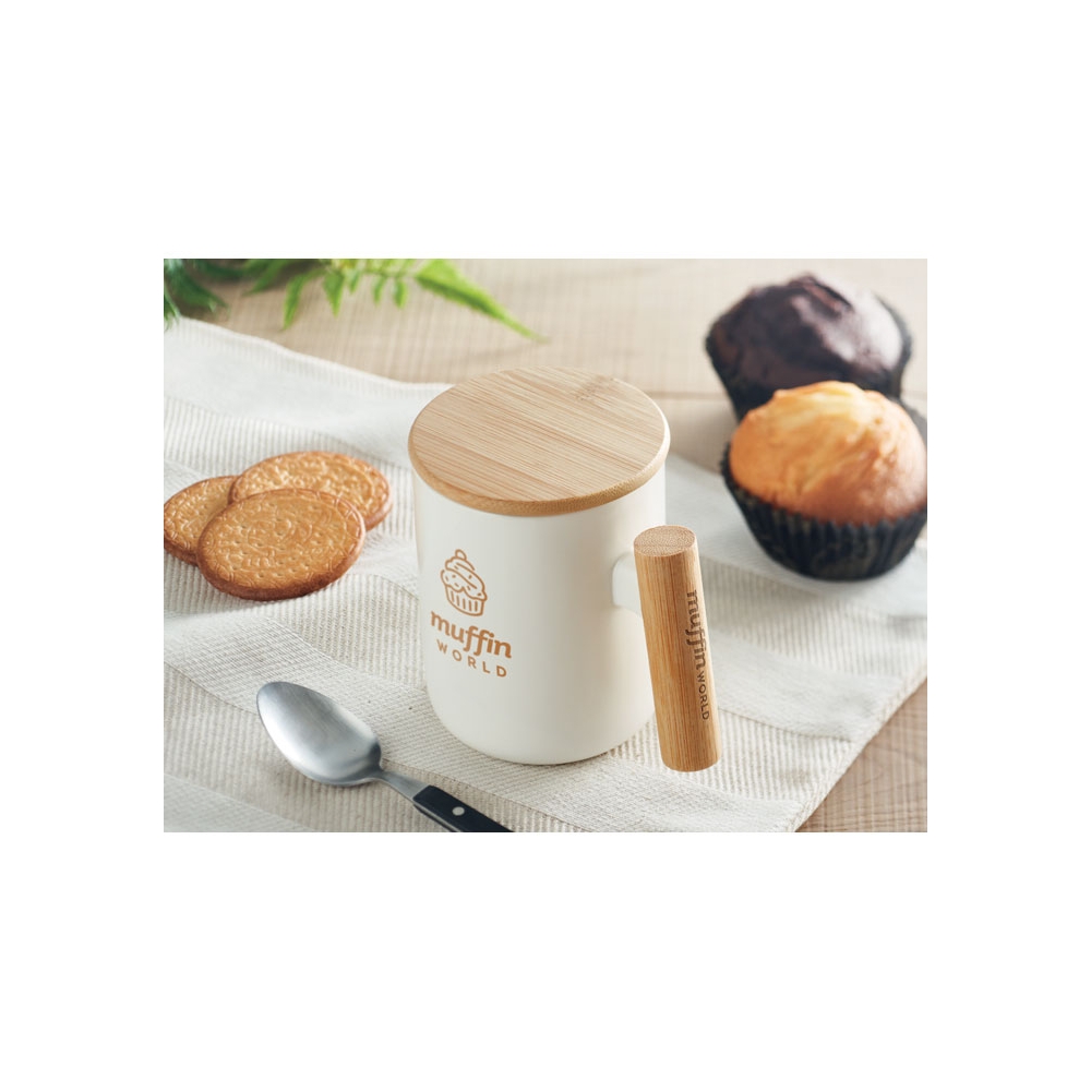 Artikel-Nr: OCBMO6781-06Kaffeebecher aus Porzellan mit Deckel und Henkel aus Bambus. Füllmenge: 380 ml. Bambus ist ein natürliches Produkt, es kann daher zu leichten Abweichungen in Farbe, Dekor und Maßen kommen.