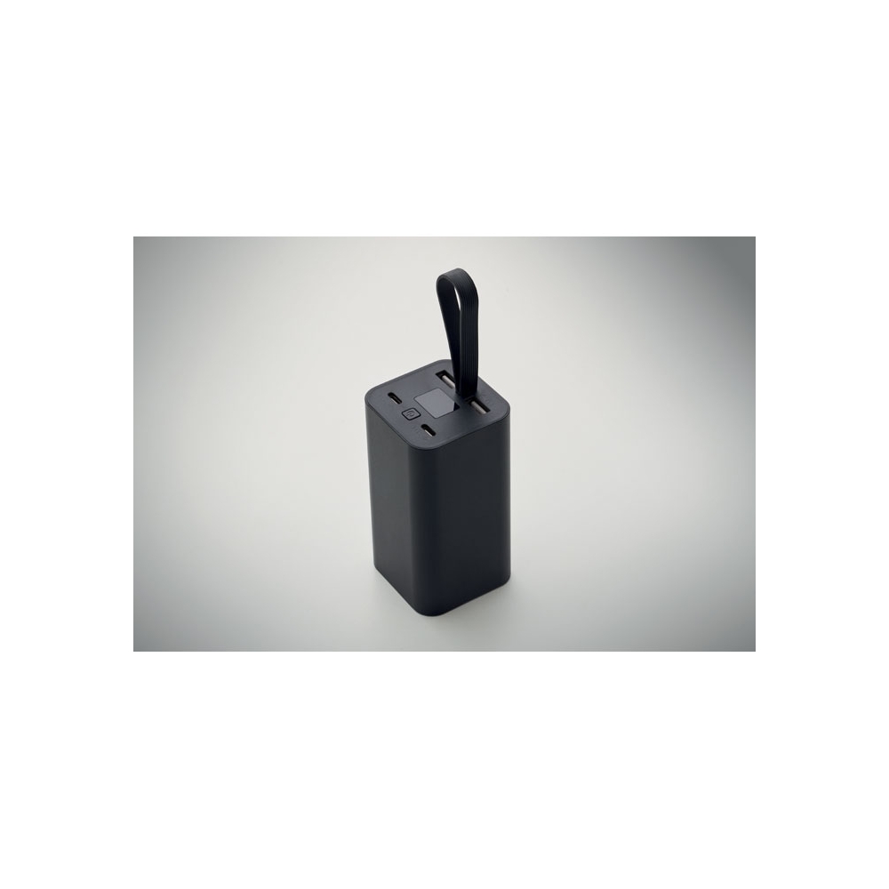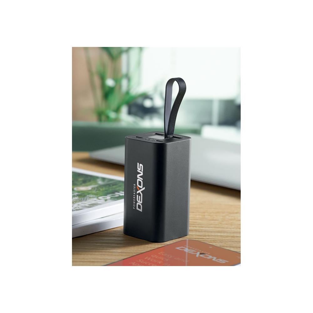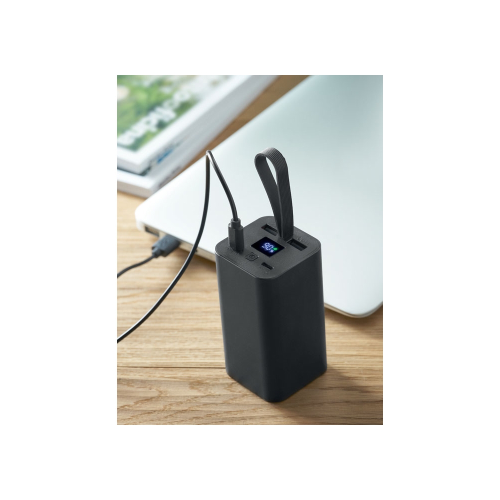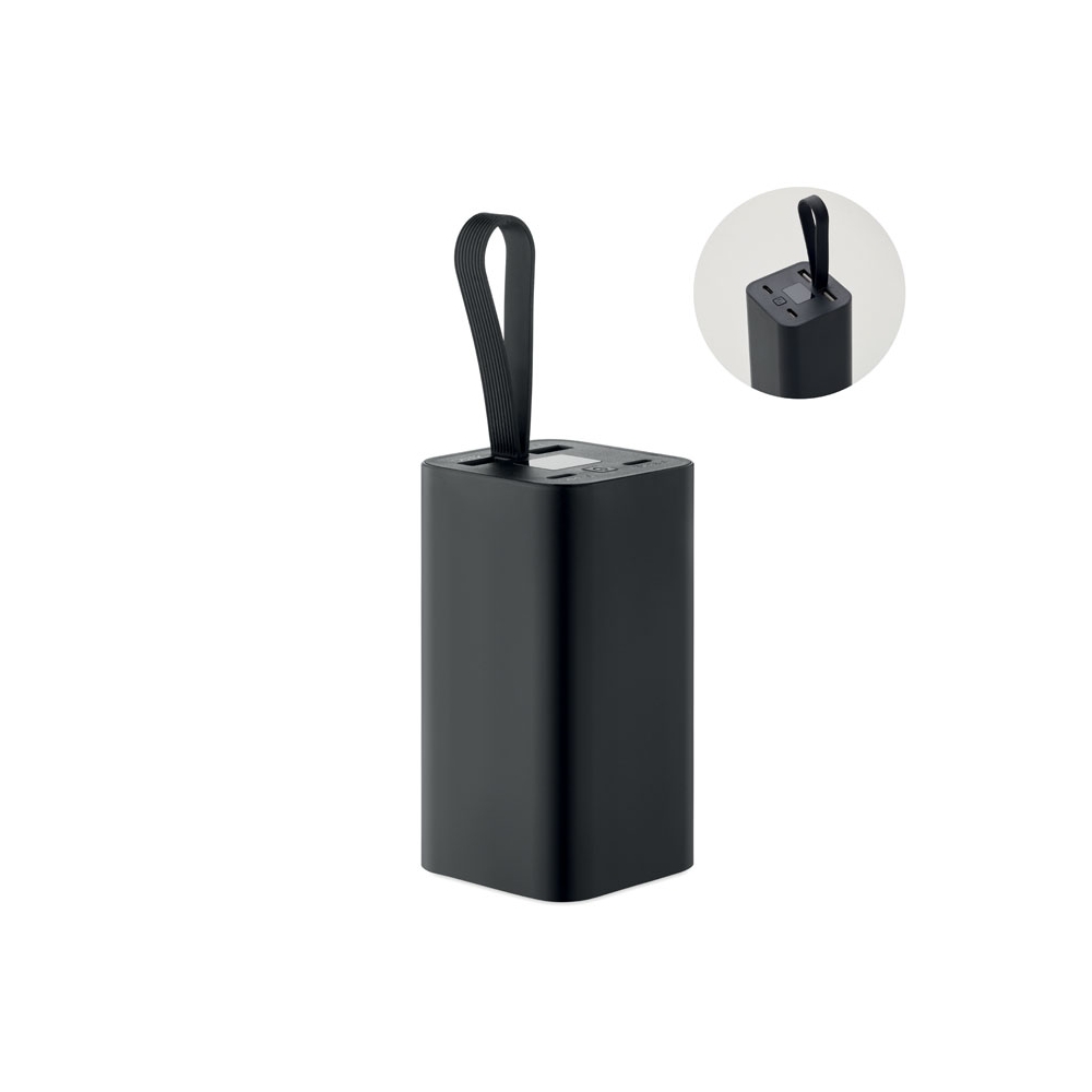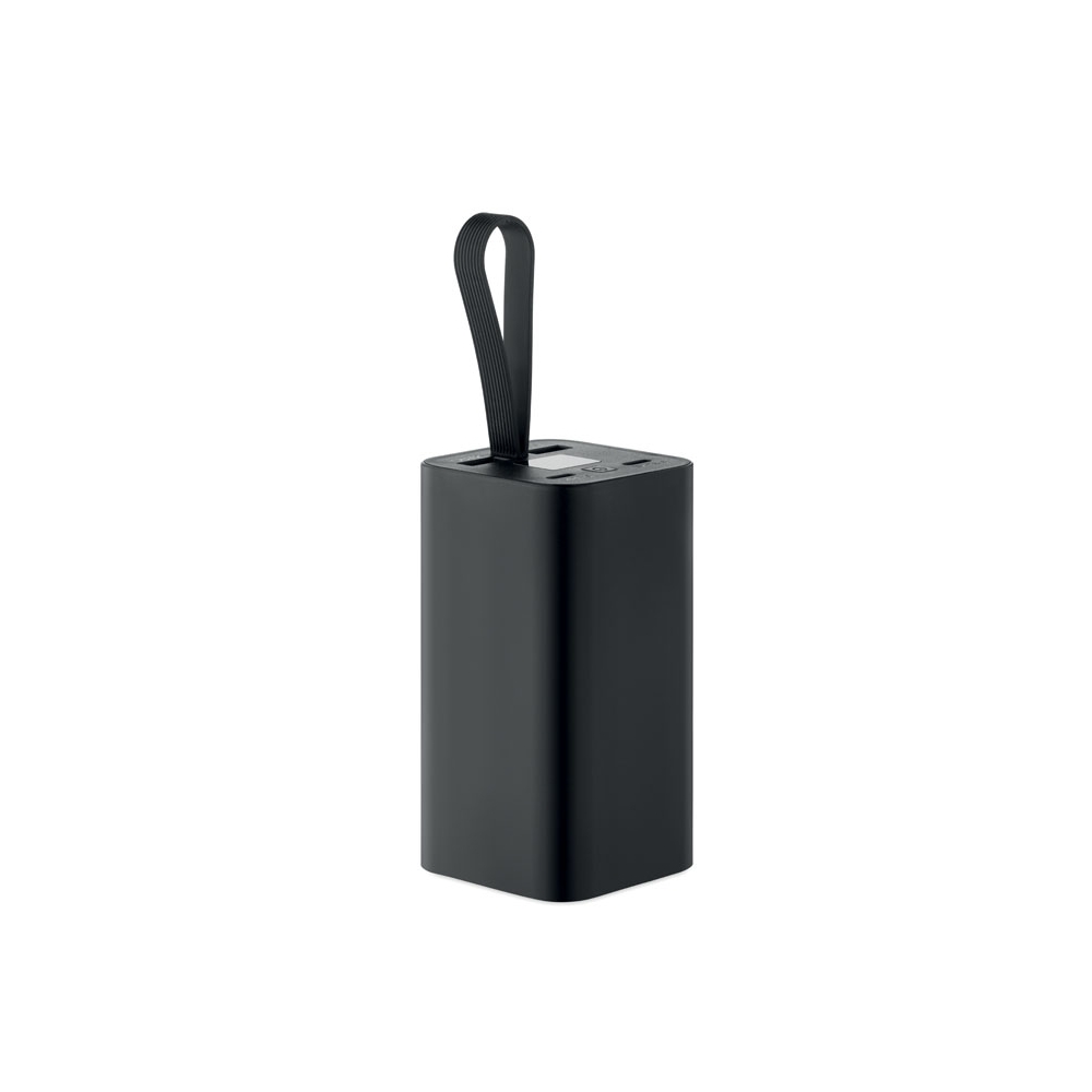 Artikel-Nr: OCBMO2943-03Powerbank 20.000 mAh aus recyceltem Aluminium. Digitale Leistungsanzeige und Schlaufe aus Silikon. Inkl. zwei Typ-C- und zwei USB-A-Ausgänge mit PD 65W-Schnellladefunktion.