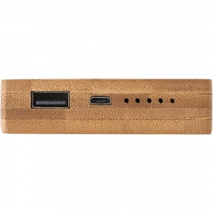 Artikel-Nr: GIV9148011Powerbankaus Bambus mit 6000 mAh Kapazität, 5V/1000 mAh Ein- und Ausgangsleistung, zwei USB-Ports und Verbindungskabel (USB und USB-C).