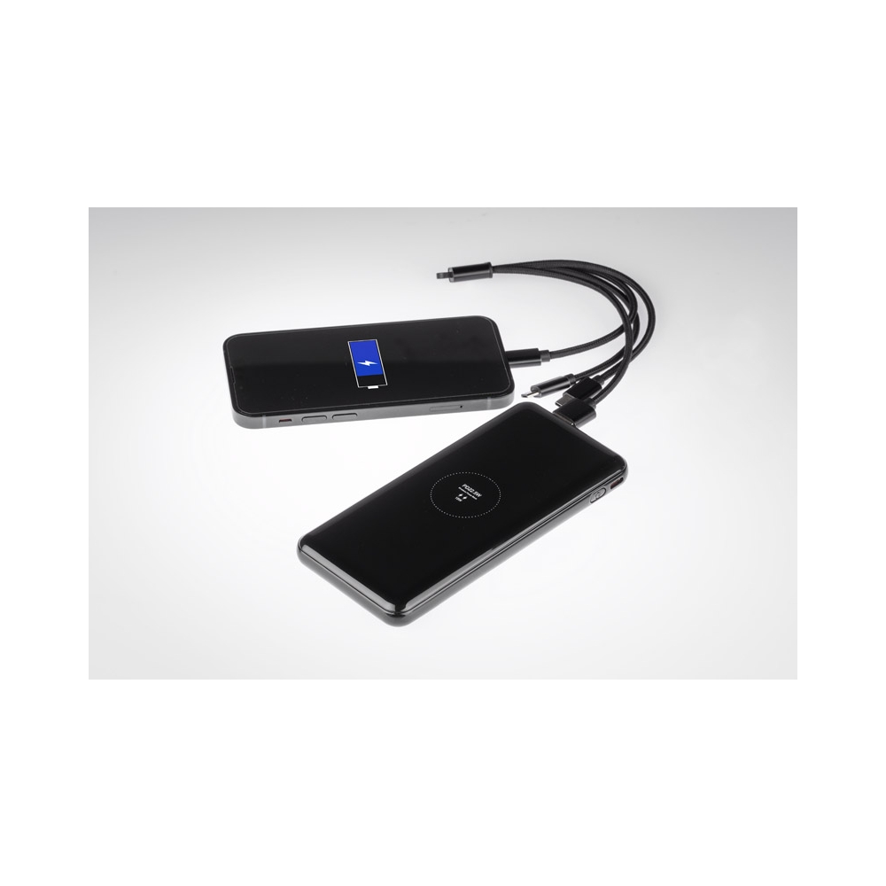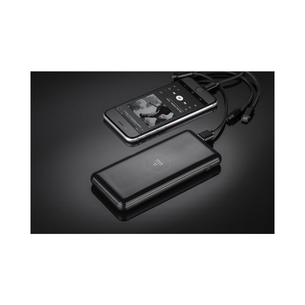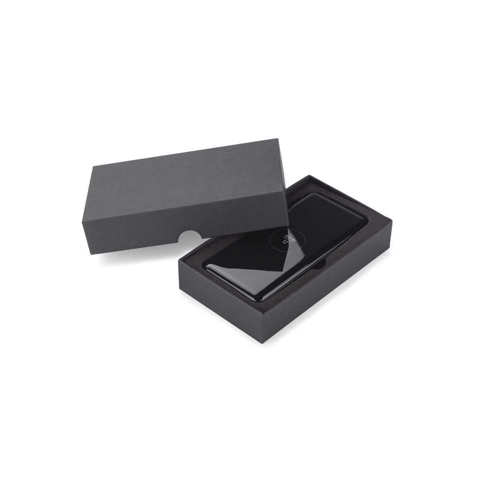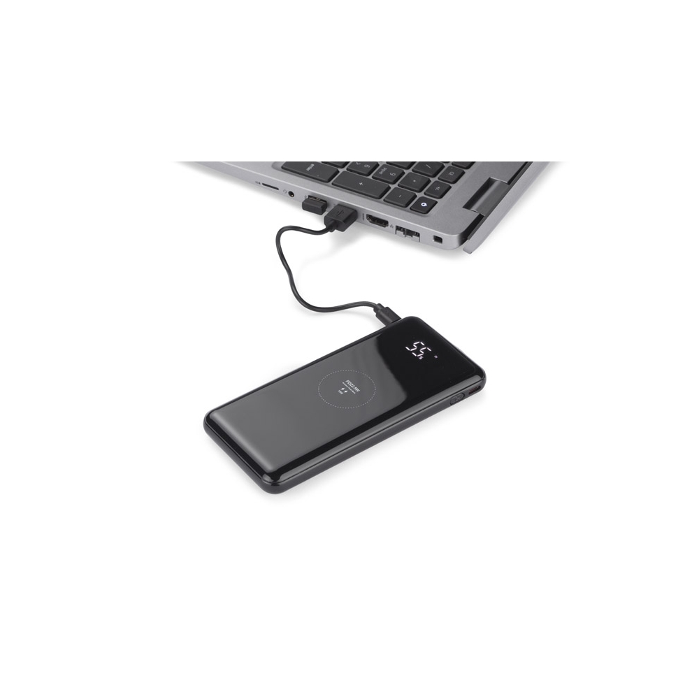 Artikel-Nr: ARD45125-02Die FUERTE 15W ist eine Powerbank mit vielen modernen Funktionen. Die wichtigste davon ist die Power Delivery (PD) Schnellladefunktion. Das ist ein Schnellladestandard, der es ermöglicht, eine hohe Leistung über einen Stecker vom Typ USB-C zu übertragen. Die Technologie zeichnet sich durch ein erhöhtes Leistungsniveau aus, im Fall der FUERTE sind es bis zu 18W. Der größte Vorteil des Power-Delivery-Standards ist die Fähigkeit, die Ladeleistung intelligent an das zu ladende Gerät anzupassen. Darüber hinaus verfügt die Powerbank über ein integriertes kabelloses Ladegerät mit einer maximalen Leistung von 15 W, ein digitales Display, das sich unter dem eleganten verspiegelten Gehäuse befindet, und eine Taschenlampe. Der USB-C-Anschluss ist bidirektional - er ist sowohl ein Eingang als auch ein Ausgang, was bedeutet, dass - einschließlich der beiden USB-A-Ausgänge - bis zu drei Geräte gleichzeitig geladen werden können. Das Ladekabel ist im Lieferumfang enthalten.