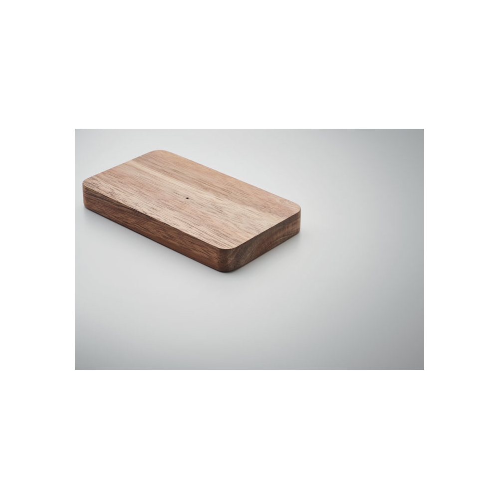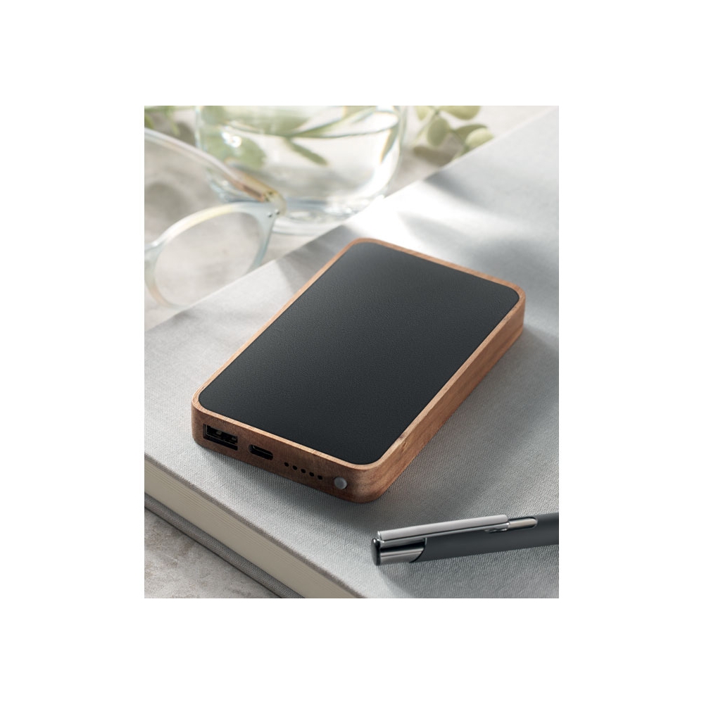 Artikel-Nr: OCBMO2185-03Powerbank 4000 mAh mit kabelloser Ladestation 15W. Gehäuse aus Akazienholz und recyceltem PU. Mit Schnellladefunktion (20W). Eingang / Ausgang: Typ-C.