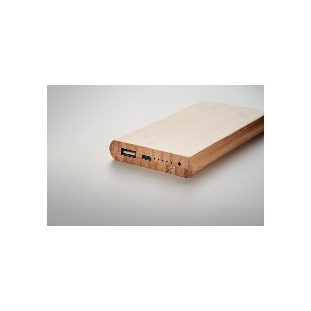 Artikel-Nr: OCBMO6815-40Powerbank 6000 mAh mit induktiver Ladestation (15W) im Bambusgehäuse. Ausgangsstrom DC5V/2A. Inklusive Anzeigelicht und USB-Kabel mit Typ-C Stecker. Bambus ist ein natürliches Produkt, es kann daher zu leichten Abweichungen in Farbe, Dekor und Maßen kommen. Eingang / Ausgang: Typ-C.
