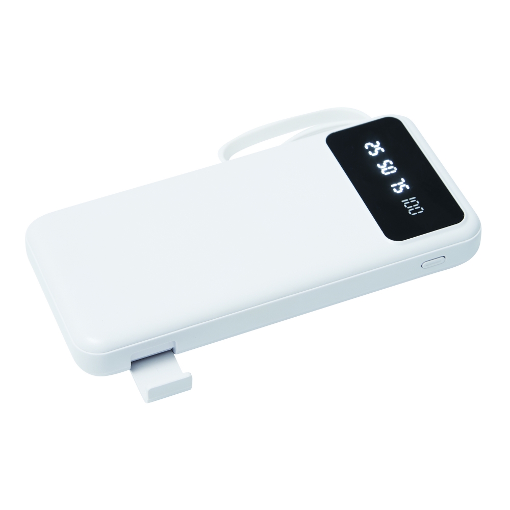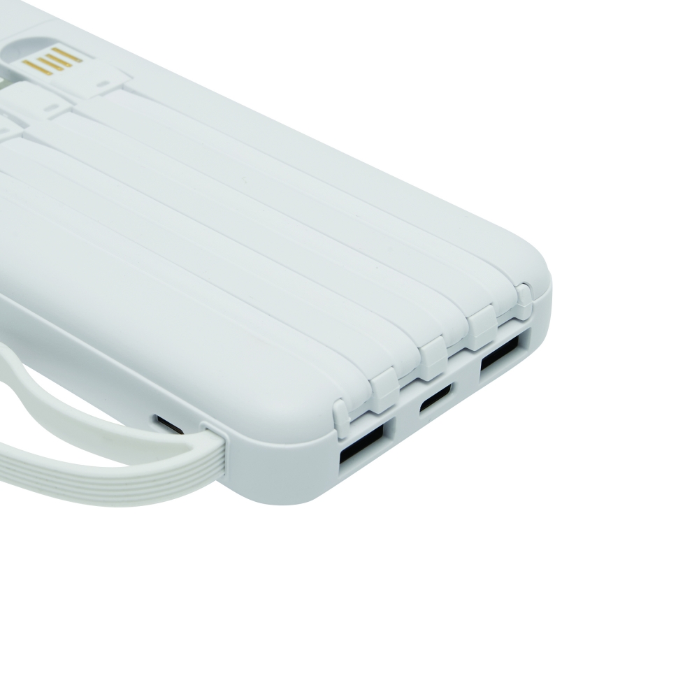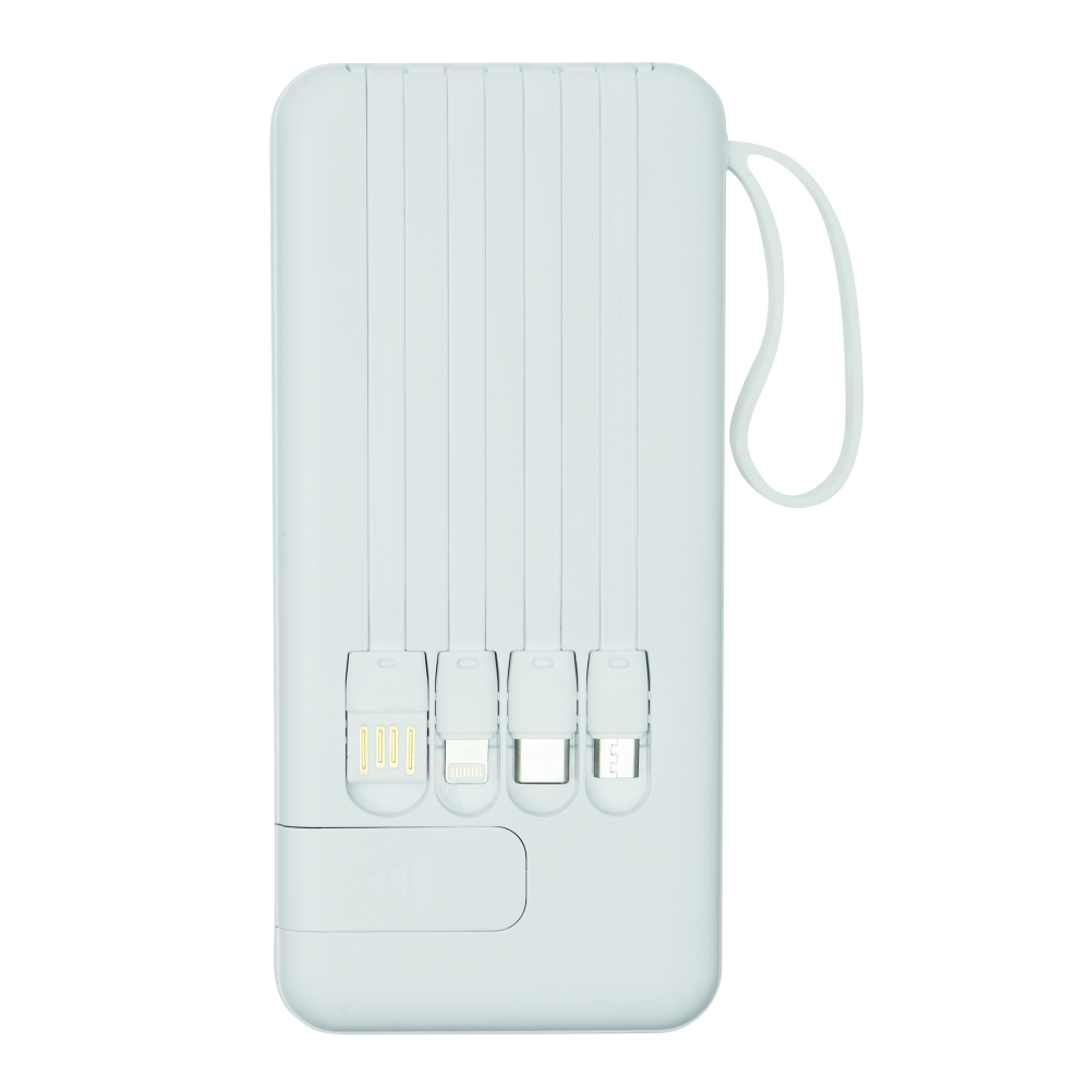 Artikel-Nr: INP58-8105024Powerbank MULTI CHARGE: geeignet für Smartphones und USB-betriebene Geräte, inkl. 4 integrierter Ladekabel auf der Rückseite (USB Typ C, Micro-USB, Lightning, USB Typ A), mit Ladestandanzeige (25 / 50 / 75 / 100 %), Ein- und Ausschalter, je 1 USB Typ C und Micro-USB Eingang und 2 USB Typ A Ausgänge, Eingangsleistung: 5V/2A, Ausgangsleistung: 5V/2A (max.), Kapazität: 10.000 mAh, leistungsstarker Lithium-Akku, mit ausziehbarem Smartphone-Halter, in Box