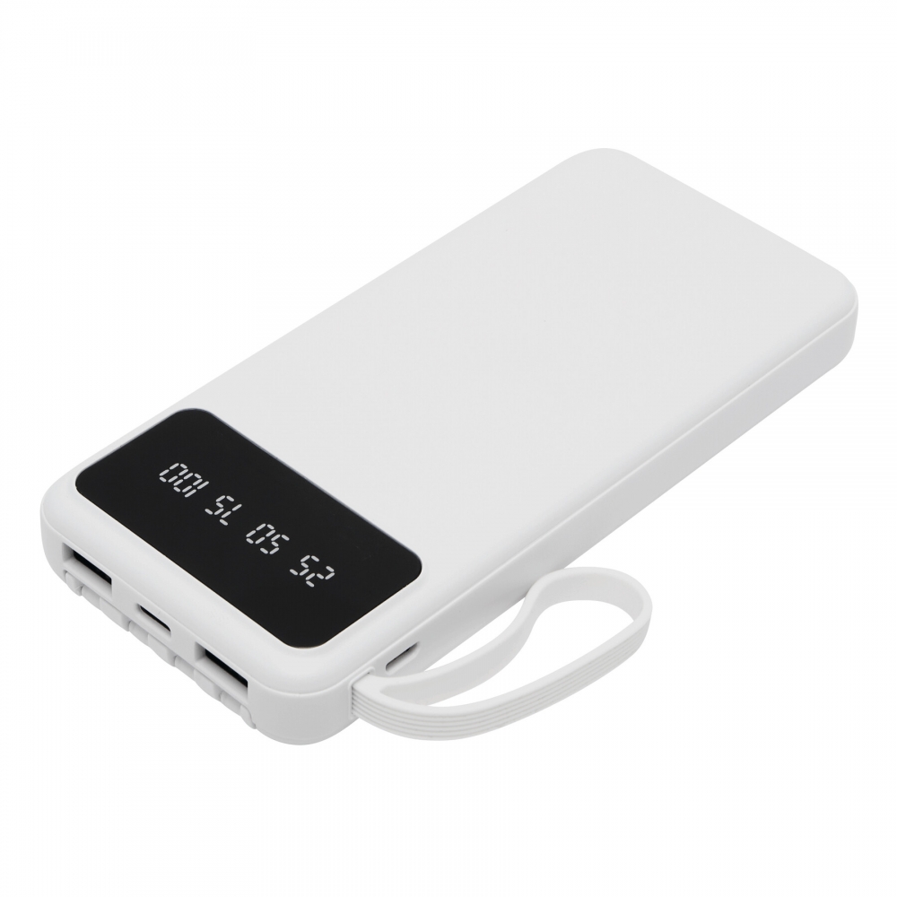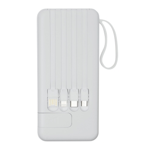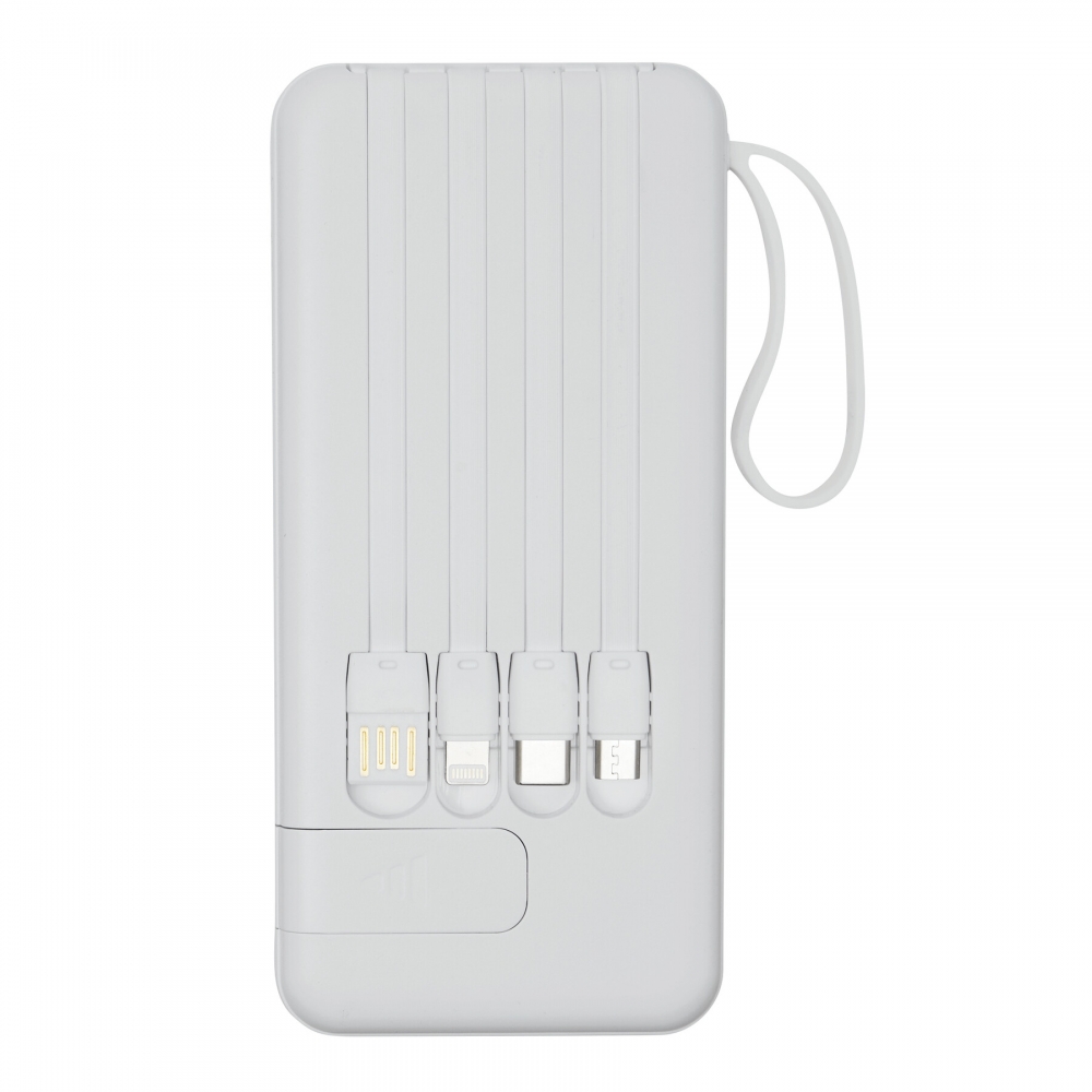Artikel-Nr: INP58-8105024Powerbank MULTI CHARGE: geeignet für Smartphones und USB-betriebene Geräte, inkl. 4 integrierter Ladekabel auf der Rückseite (USB Typ C, Micro-USB, Lightning, USB Typ A), mit Ladestandanzeige (25 / 50 / 75 / 100 %), Ein- und Ausschalter, je 1 USB Typ C und Micro-USB Eingang und 2 USB Typ A Ausgänge, Eingangsleistung: 5V/2A, Ausgangsleistung: 5V/2A (max.), Kapazität: 10.000 mAh, leistungsstarker Lithium-Akku, mit ausziehbarem Smartphone-Halter, in Box