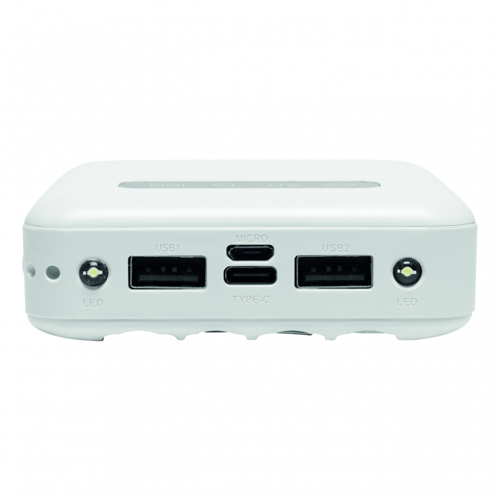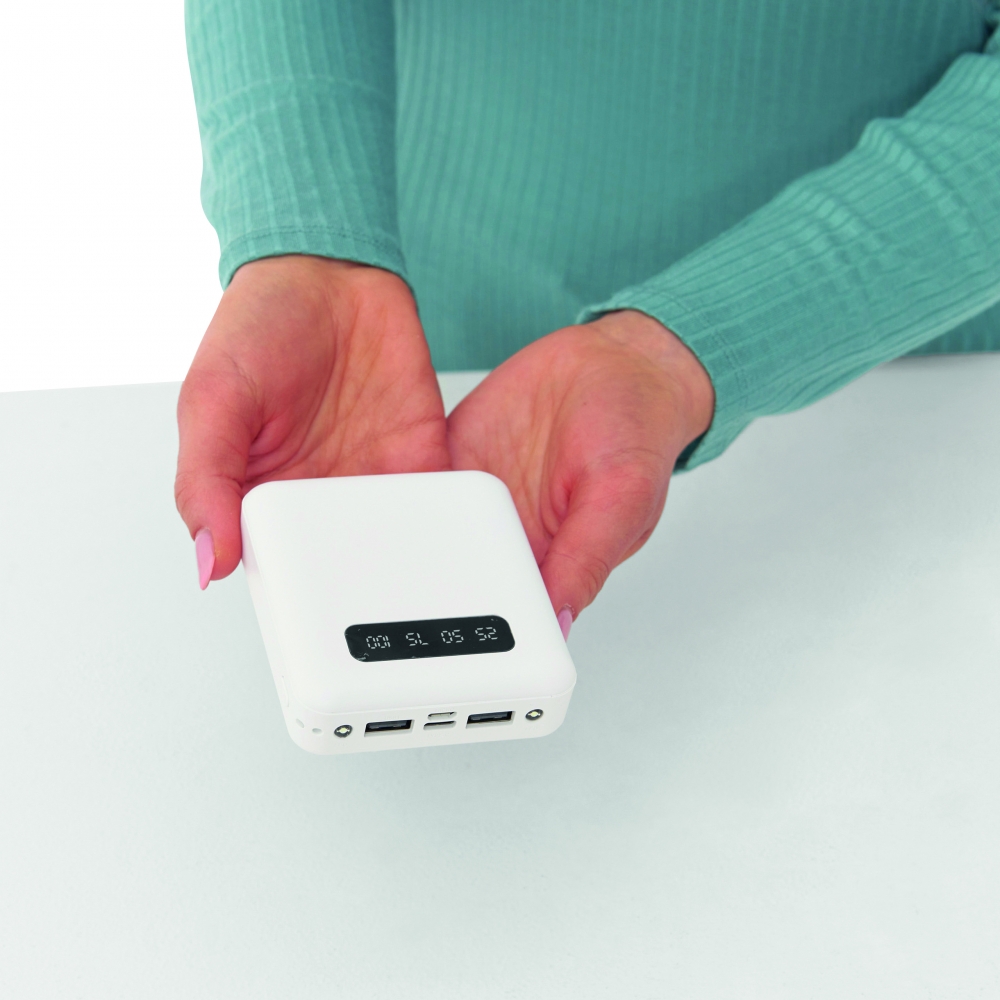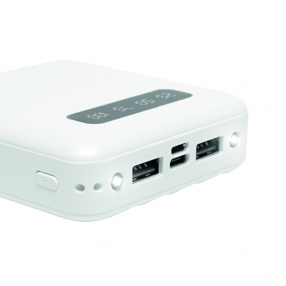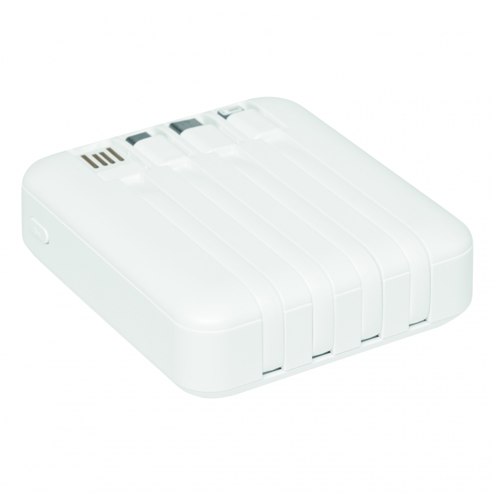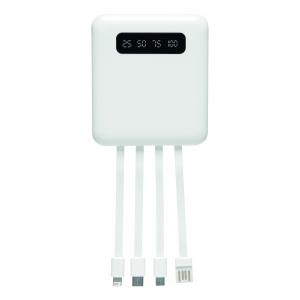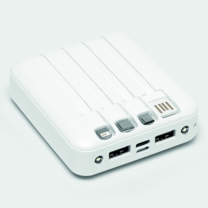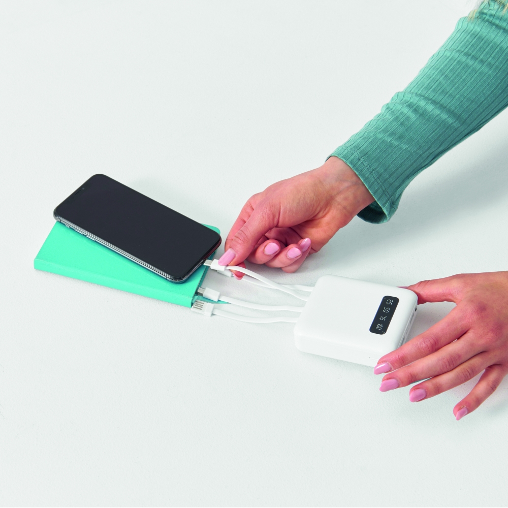Artikel-Nr: INP56-1107384Powerbank PRECIOUS: geeignet für Smartphones und USB-betriebene Geräte, inkl. 4 integrierter Ladekabel auf der Rückseite (USB Typ C, Micro-USB, Lightning, USB Typ A), mit Ladestandanzeige (25 / 50 / 75 / 100 %), Ein- und Ausschalter, je 1 Typ C und Micro-USB Eingang und 2 USB Typ A Ausgänge, Eingangsleistung: 5V/2A, Ausgangsleistung: 5V/2A (max.), Kapazität: 5.000 mAh, leistungsstarker Lithium-Akku, Taschenlampe mit 2 weißen LED, in Box