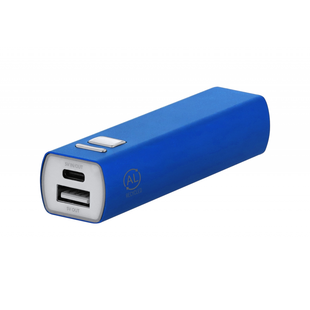 Artikel-Nr: AND735487-06Powerbank aus recyceltem Aluminium mit 2600 mAh Akku. Mit 1 USB- und 1 USB-C-Ladeanschluss. USB-C-Eingangsanschluss. Inklusive USB-Ladekabel.