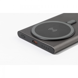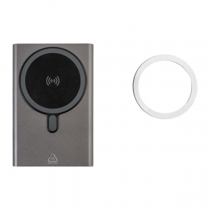 Artikel-Nr: AND864051-80Powerbank aus recyceltem Aluminium mit eingebautem magnetischem Wireless-Charger (15 W) und 5000 mAh Akku. Mit USB-C-Eingang und Ladebuchse. Inklusive selbstklebendem Metallring zur Nutzung der Magnetfunktion auf jedem kabellos aufladbaren Gerät. Kompatibel mit iPhone® 12 oder neuer. Inklusive USB-Ladekabel.