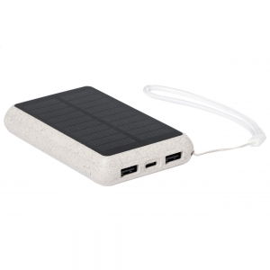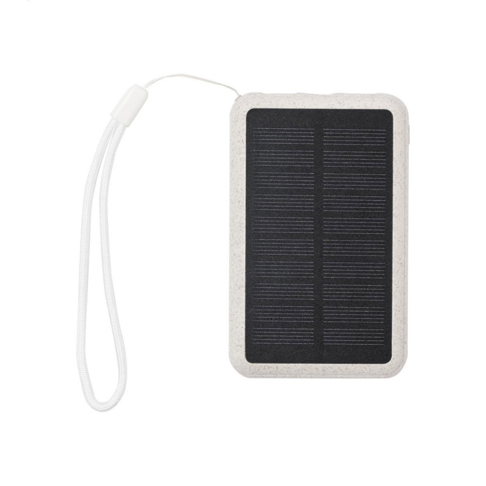 Artikel-Nr: AND733392-00USB-Powerbank im ökologischen Weizenstroh-Kunststoffgehäuse mit eingebautem Solarladegerät und 5000 mAh Akku. Mit 2 USB- und 1 USB-C-Ladeanschluss. USB-C-Eingangsanschluss.