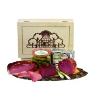 Artikel-Nr: 7980010Das Präsent besteht aus einem Stück Nussschinken, ca. 450g, im Netz vakuumverpackt, einem Stück Gourmet Bauernschinken, ca. 500g, mild geräuchert, vakuumverpackt, einer Scheibe westf. Landrauchschinken, ca. 200g egalisiert, über Buchenholz würzig geräuchert, ein Glas Gewürzgurken süß-sauer, natürlich vom Bauernhof, 580 ml, im Original- Weckglas und einem Paket Delikatess-Pumpernickel, Roggenvollkornschrotbrot, 500 g, in dekorativer Holztruhe, vielseitig verwendbar, im Umkarton bruchsicher und versandfertig verpackt.