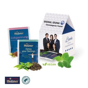 Artikel-Nr: CDL91099It's Teatime! Die Mischung aus ausgewählten Spitzen-Tees aus dem Hause Meßmer verwöhnt auch anspruchsvolle Teefreunde und Teefreundinnen. 10 Beutel verbergen sich im attraktiven Tee-Haus. Starten Sie Ihre werbestarke Teatime.