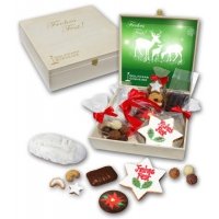 Artikel-Nr: D5671147Edle Holzkiste befüllt mit köstlichen Pralinen 80g, feinstem Christstollen 200g, Weihnachtgebäck 100g, Saftprinten 90g, verziertem, großen Zimtstern 100g, Schoko - Christbaumanhänger aus Printenteig 45g.
