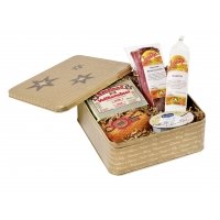 Artikel-Nr: 7980011Dieses Set besteht aus einem Stück Gourmet Bauernschinken, vakuumverpackt, mild geräuchert, (ca. 500 g), ein Stück westf. Salami 1 a (300 g), einer Dose Kalbspaté (80 g), ein Stück 'Börde-Speck', Gouda-Spezialität ohne Rinde, auf Buchenspänen und Wacholderbeeren geräuchert, ca. 250g, einer Packung Emsland Vollkornbrot (500 g). In weihnachtlicher Schmuckdose und im Umkarton bruchsicher und versandfertig verpackt.