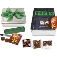 Inhalt: Metall-Geschenkbox mit einer Pralinenform aus Silikon (für die Herstellung von Glückskleeblättern aus Schokolade), 100 g Bitterschokolade, 1 Tütchen Vanillezucker, 1 Fläschchen Rum-Aroma und einem Rezept-Leporello.