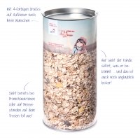 Artikel-Nr: 49430326Ob mit Schoko-Stückchen oder verschiedenen Früchten: Diese Müsli-Mischungen sorgen für einen gesunden, leckeren Start in den Tag. Abgefüllt werden sie in eine dekorative Röhren-Präsentbox aus stabilem transparentem Kunststoff mit silberfarbenem Deckel oben und unten als Verschluss. Als originelles Präsent ist die Müsli-Röhrenbox idealerweise bei Promotion-Aktionen rund um Gesundheit und Wellness einsetzbar, eignet sich aber auch zur Übergabe auf Messen oder als Mitbringsel bei Kundenbesuchen. Die Box ist mit einem Aufkleber versehen, der mit einer Druckfläche von 200 x 40 mm Raum auch für großformatige Aktionsslogans oder umfangreichere Werbebotschaften bietet. Er kann vierfarbig bedruckt und nach eigenen Wünschen und Vorstellungen gestaltet werden. Mit dem attraktiven 'Energiespender aus der Röhre' sind Sie bereits zum Frühstück in aller Munde, die Werbebotschaft gelangt auf genussvoll-effektive Art und Weise direkt auf den Frühstückstisch oder in die Kaffeeküche und bleibt dort – auch aufgrund der Füllmenge von 250 g – lange präsent.