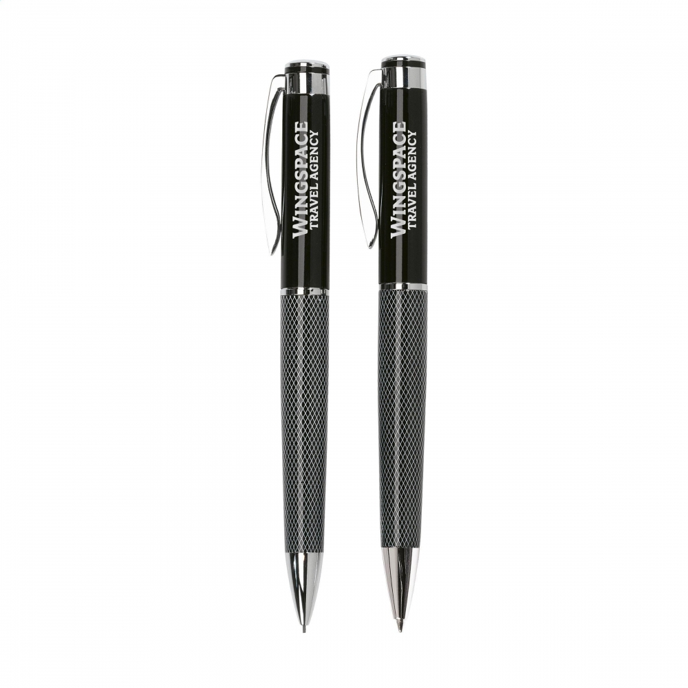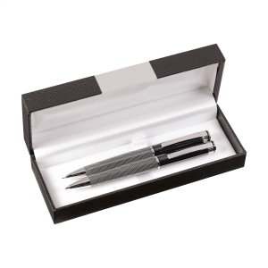 Artikel-Nr: CLP266425-001128Hochglanz-Schreibset: blauschreibender Kugelschreiber mit Dreh-Klicksystem und einem Bleistift mit 3 HB-Minen (0,9 mm). Pro Set in einer Kassette mit silberfarbenem Akzent. Ein auffallend schickes Set.