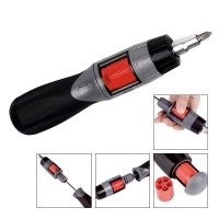 Artikel-Nr: 57383080SW-GRProfi-Ratschen-Magazin-Schraubendreher mit 10 Bits und Bit-Zufuhr-Automatik. Dieser Schraubendreher mit Ratsche und automatischer Bitzuführung ist wegweisend. Ziehen Sie einfach den Griff zurück, wählen Sie das benötigte Bit in der Trommel aus und schieben den Griff wieder in die Ausgangsposition zurück. Nun ist das gewünschte Bit in der magnetischen Bitaufnahme positioniert und einsatzbereit. Ein zweites Magazin mit 5 weiteren Bits ist im Griffende des Schraubendrehers untergebracht und sorgt für einen vielseitigen Einsatz. Die hochwertige Ratsche garantiert ein kraftschonendes Arbeiten bei längeren Schraubarbeiten und die magnetische Bitaufnahme fixiert komfortabel das Bit. Alle Bits sind aus CRV-Stahl 6150 Rockwell 54° gefertigt: 3x Phillips (PH / PH1 / PH2), 2x Schlitz (4 / 5 mm), 2x Inbus (SW3 / SW4), 3x Torx (T15 / T20 / T25).