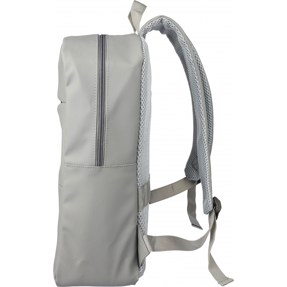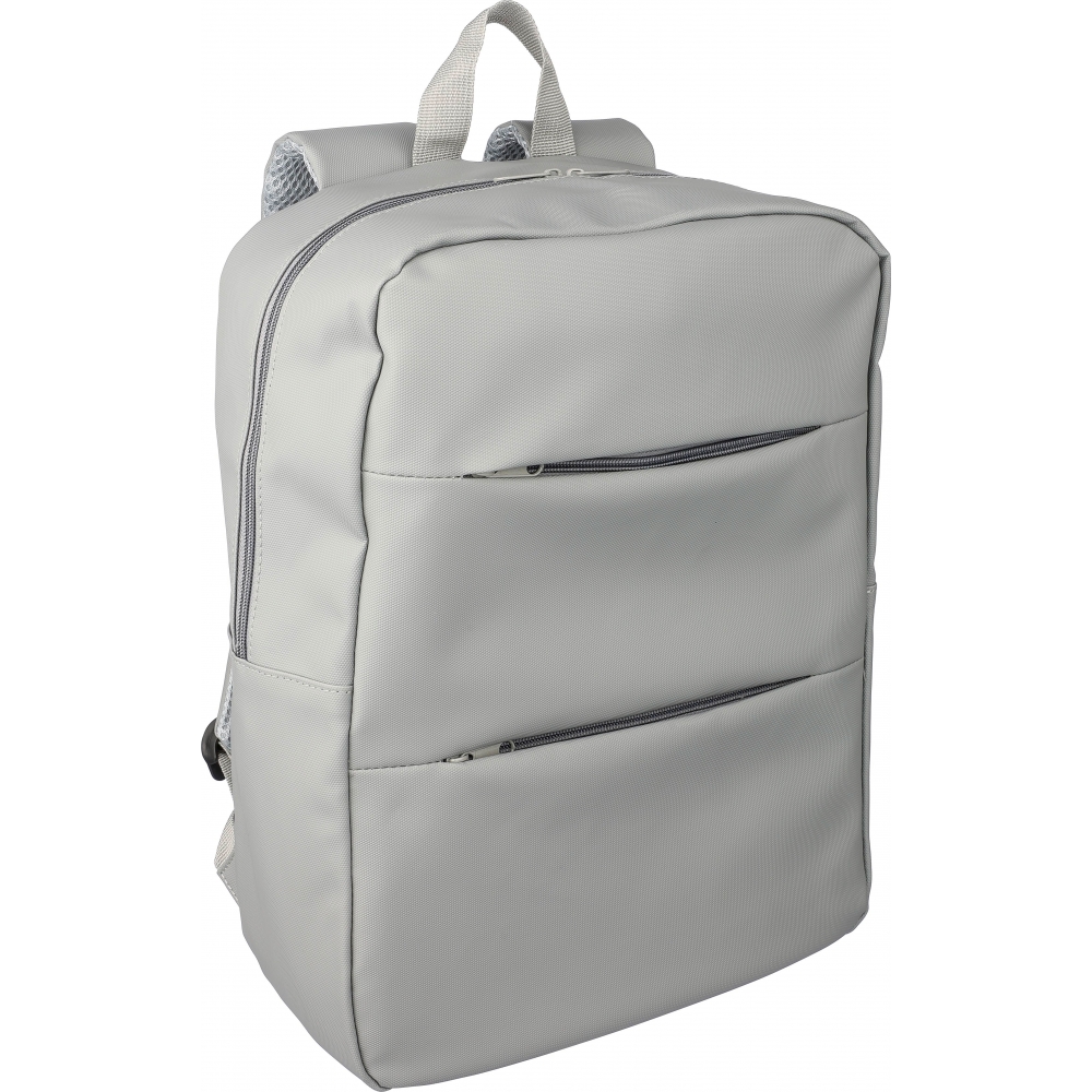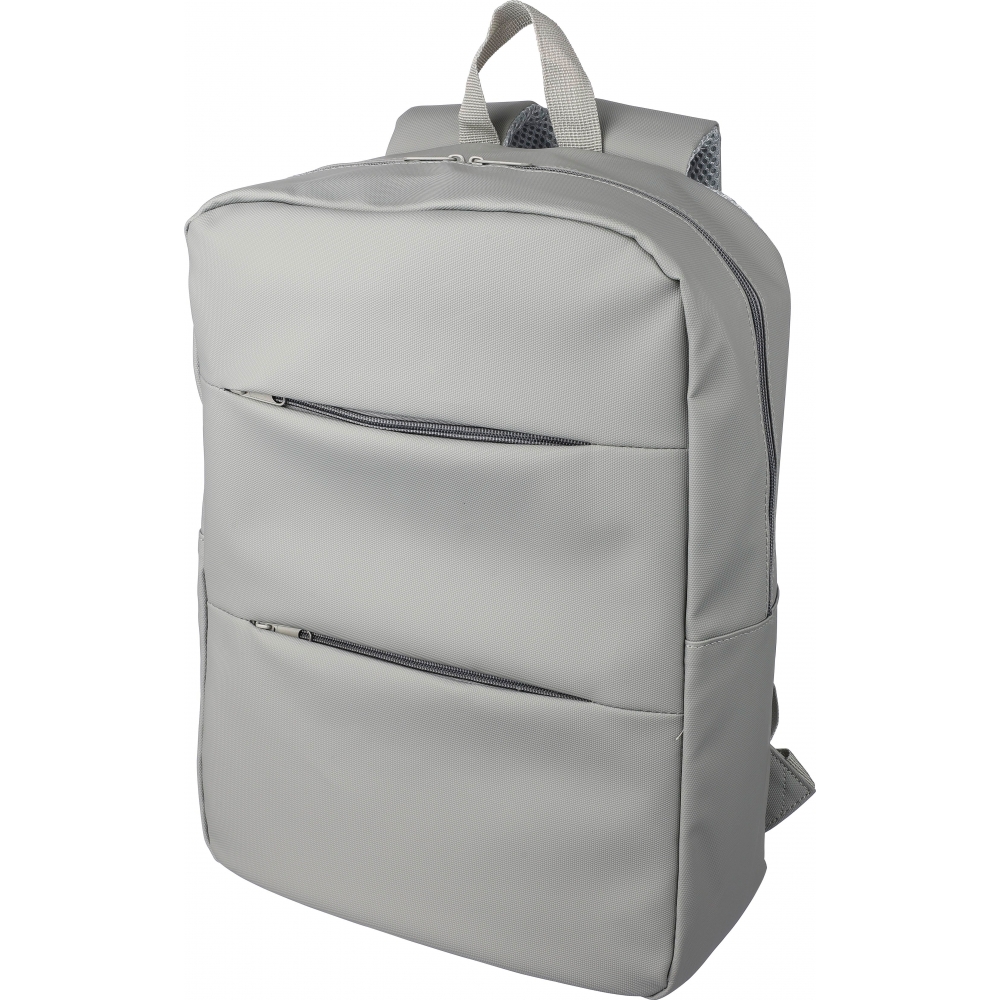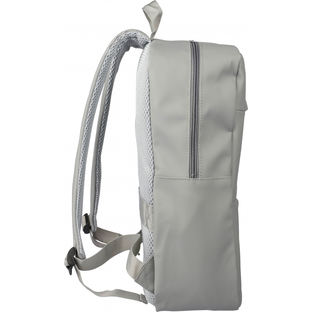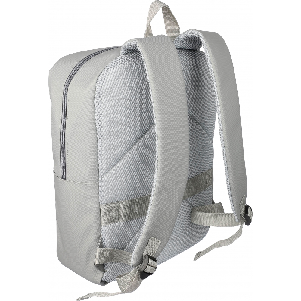 Artikel-Nr: GIV1172253001076Laptop-Rucksack aus PU (15”) mit zwei Reißverschlusstaschen auf der Vorderseite, einer großen Reißverschlusstasche mit Klettverschluss für den Laptop und mehreren Innenfächern. Belüftete, gepolsterte Rückseite mit Trolleyriemen und verstellbaren Schultergurten. Wasserabweisend.