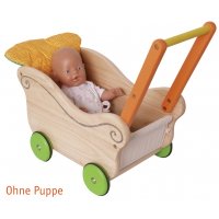 Nostalgischer Puppenwagen aus Holz für stolze Puppenmuttis und coole Teddybärhalter. Mit waschbarem Wendekissen. Achtung! Nicht geeignet für Kinder unter 36 Monaten.