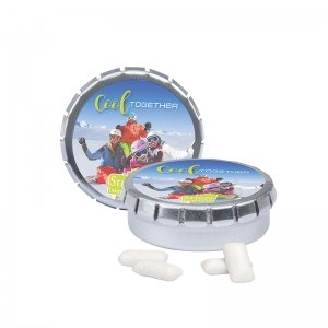 Artikel-Nr: PUC1012.00028Runde Dose mit Springdeckel, silber aus Metall, individuell bedruckt. Mit Originalitätsverschluss und Aufreißperforation, Weißblech 98% recycelbar. Inhalt: zuckerfreie KoRo Menthol Kaugummis, 21 g. Produktionsbedingt leichte Sprühnebelspuren am Motivrand möglich