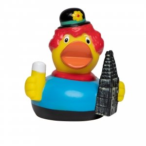 Artikel-Nr: GUT32045… denn do jehööt hä hin. Deshalb hat unsere CityDuck® auch nur die Miniaturausgabe des Kölner Wahrzeichens im Handgepäck dabei. Und da nicht nur Bayern berühmt für sein Bier ist, prostet unser Schnabeltier Ihnen fröhlich mit einem Glas Kölsch zu. Die richtigen Karnevalsumzüge finden zwar im Frühling statt, doch eigentlich ist in der Rheinmetropole ganzjährig Faschingsstimmung. Da lag es nahe, unserer Ente ein farbenfrohes Kostüm zu verpassen. Nur mit der Positionierung der Clownsnase hatten wir so unsere Schwierigkeiten...